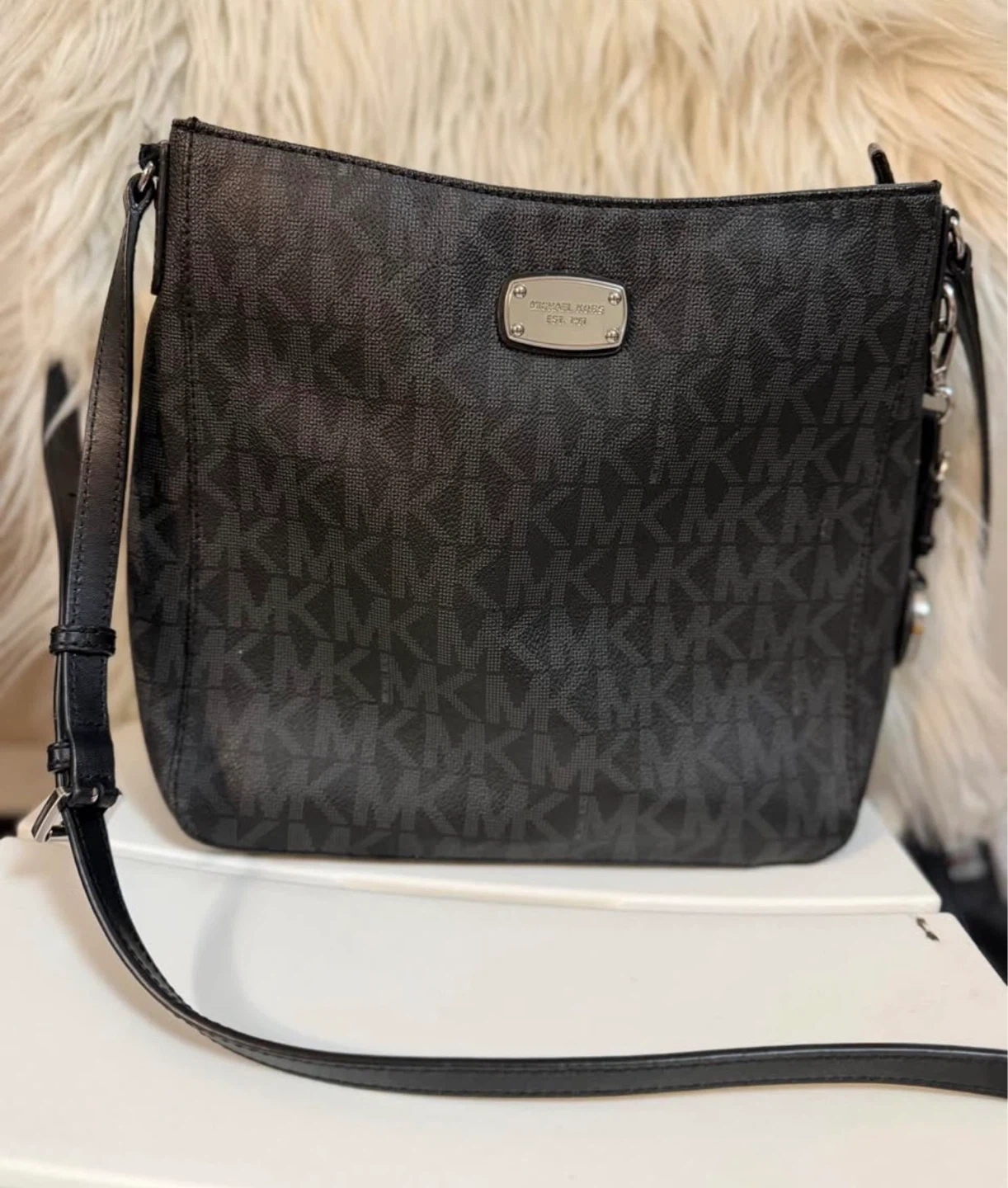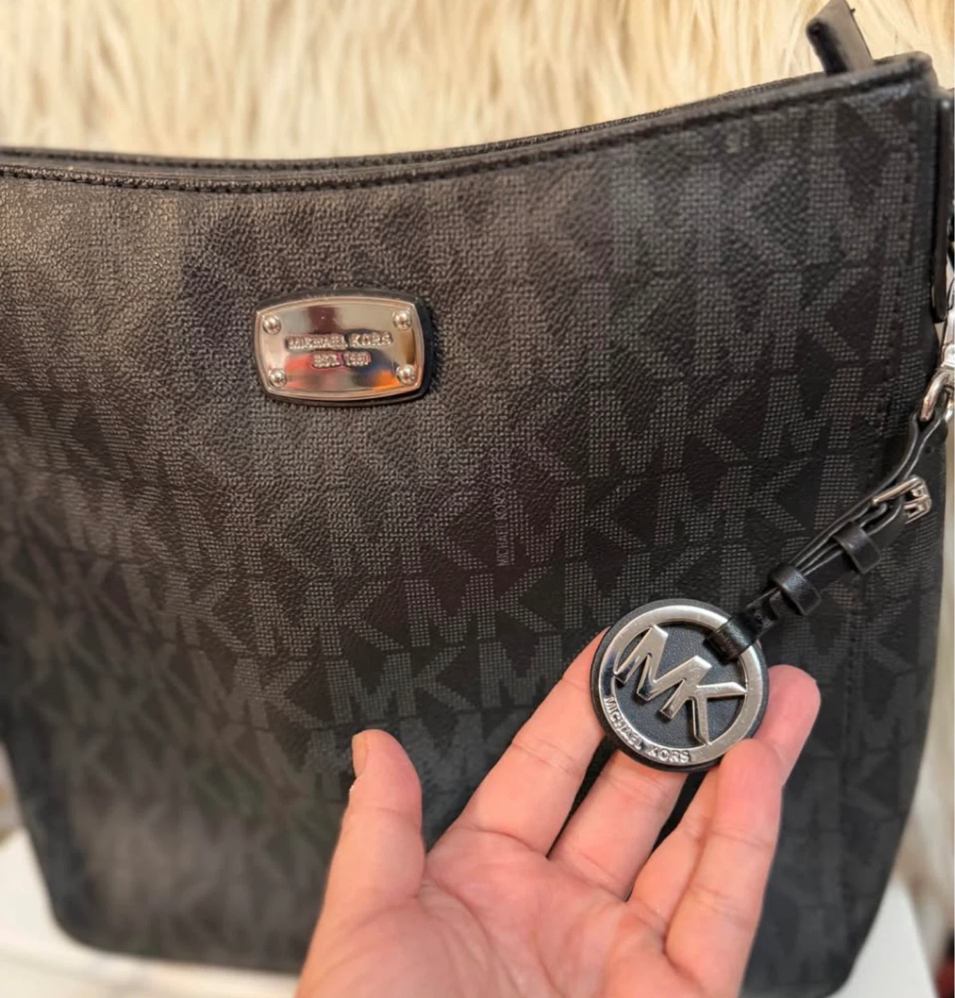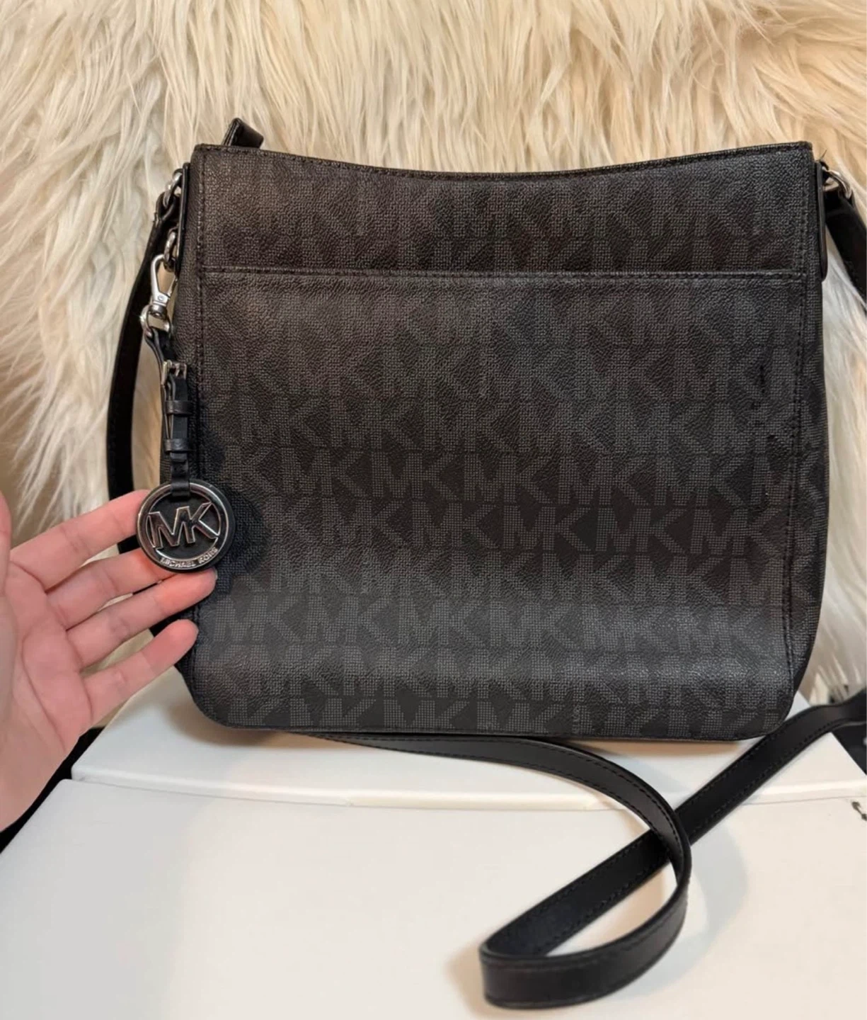 This Michael Kors crossbody bag features the signature MK logo print all over. It has a zip closure and an interior zip pocket. Silver-tone hardware and a decorative MK charm are included. Perfect for everyday use!