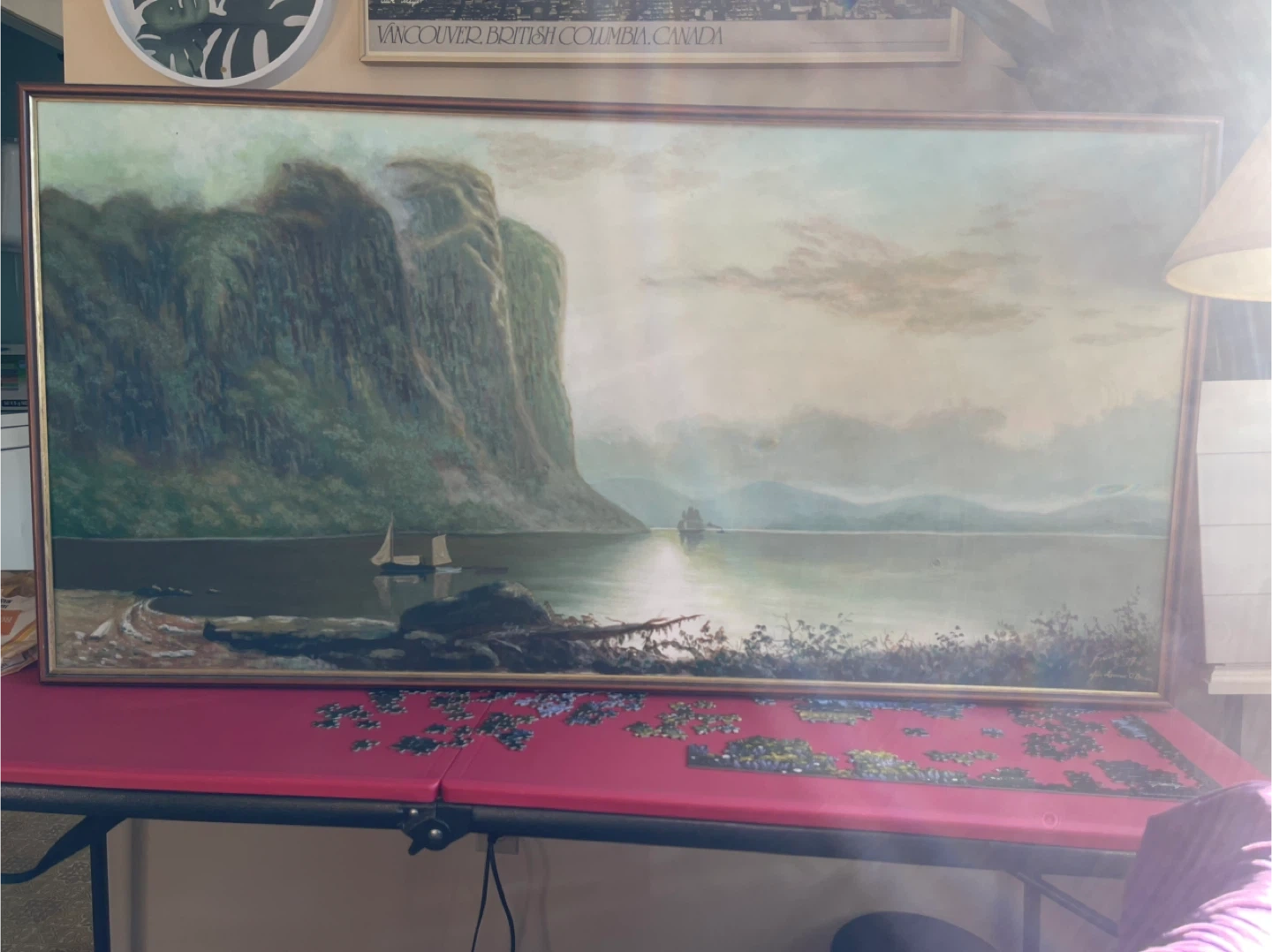 Original landscape painting signed Figueroa 77, after Lucius O'Brien. It depicts a serene coastal scene with sailboats and majestic mountains. Framed art for your home.