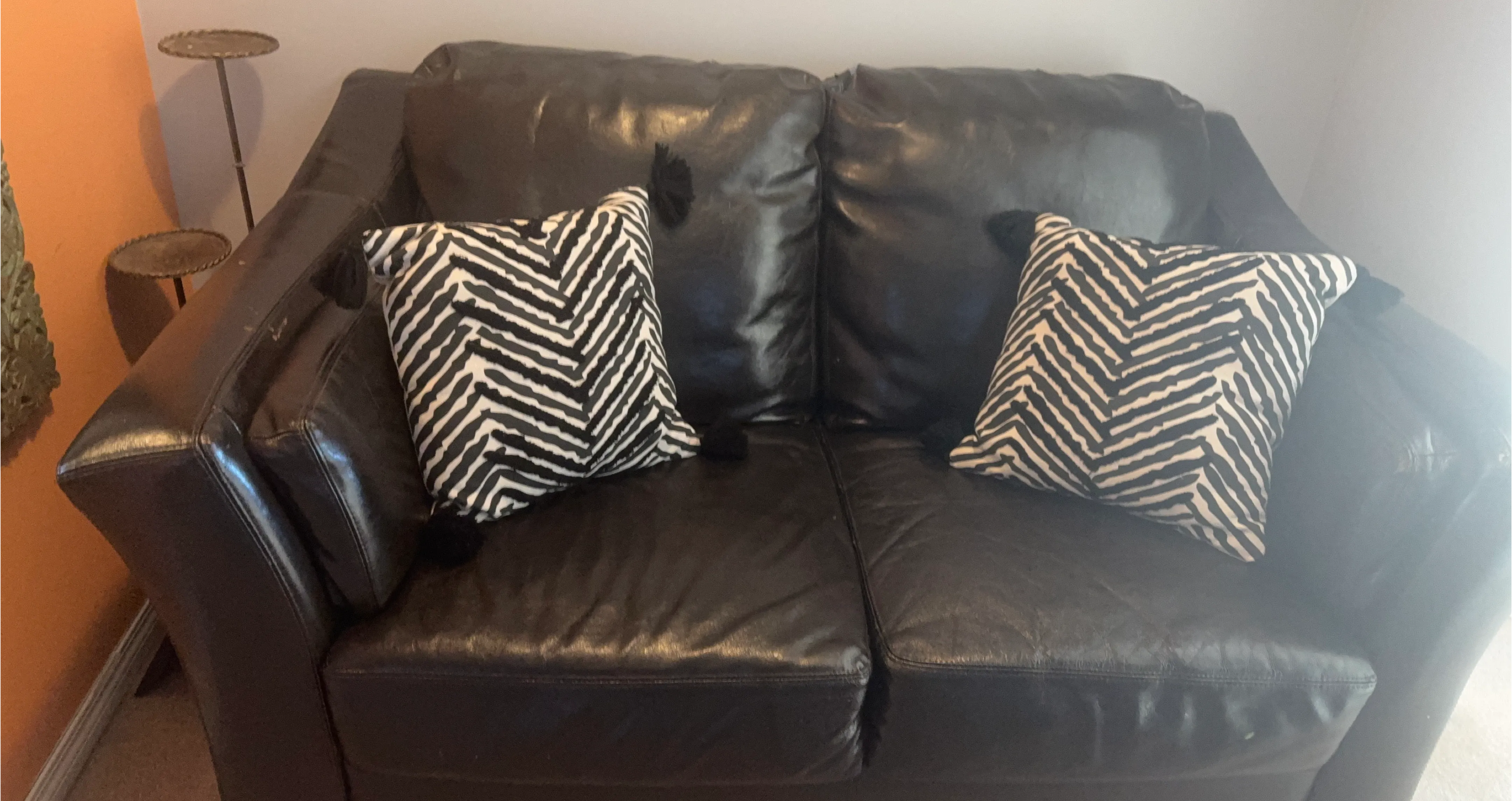 Selling a gently used black leather loveseat. It comes with two decorative pillows with a black and white chevron pattern. Perfect for a smaller space or apartment