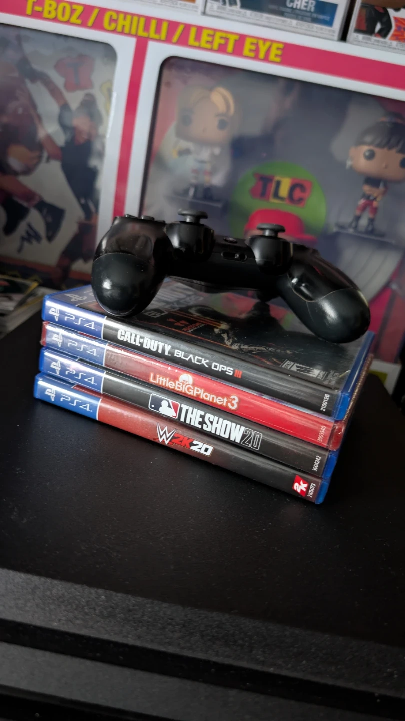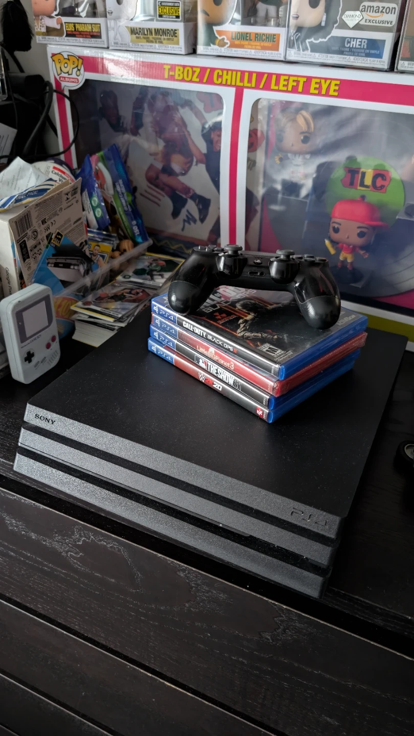 Selling a Sony PlayStation 4 Pro console. It comes with one black DualShock 4 controller and four games. Games included are Call of Duty: Black Ops III, LittleBigPlanet 3 (sealed), WWE 2K20, and The Show 20.