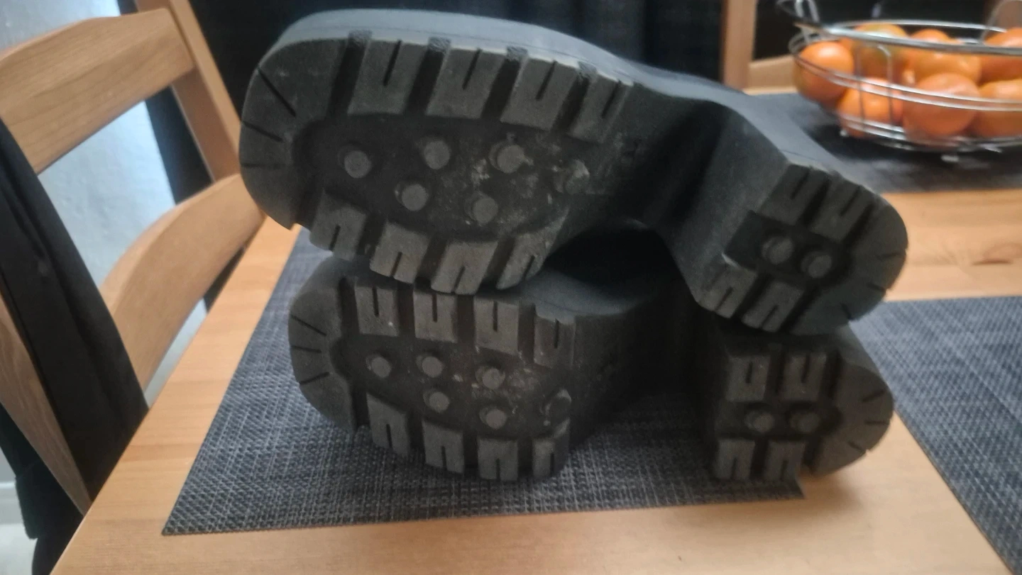 These black ankle boots feature a chunky heel and platform sole. They're made from a faux leather material with a pull-on style. The lug sole provides good traction.