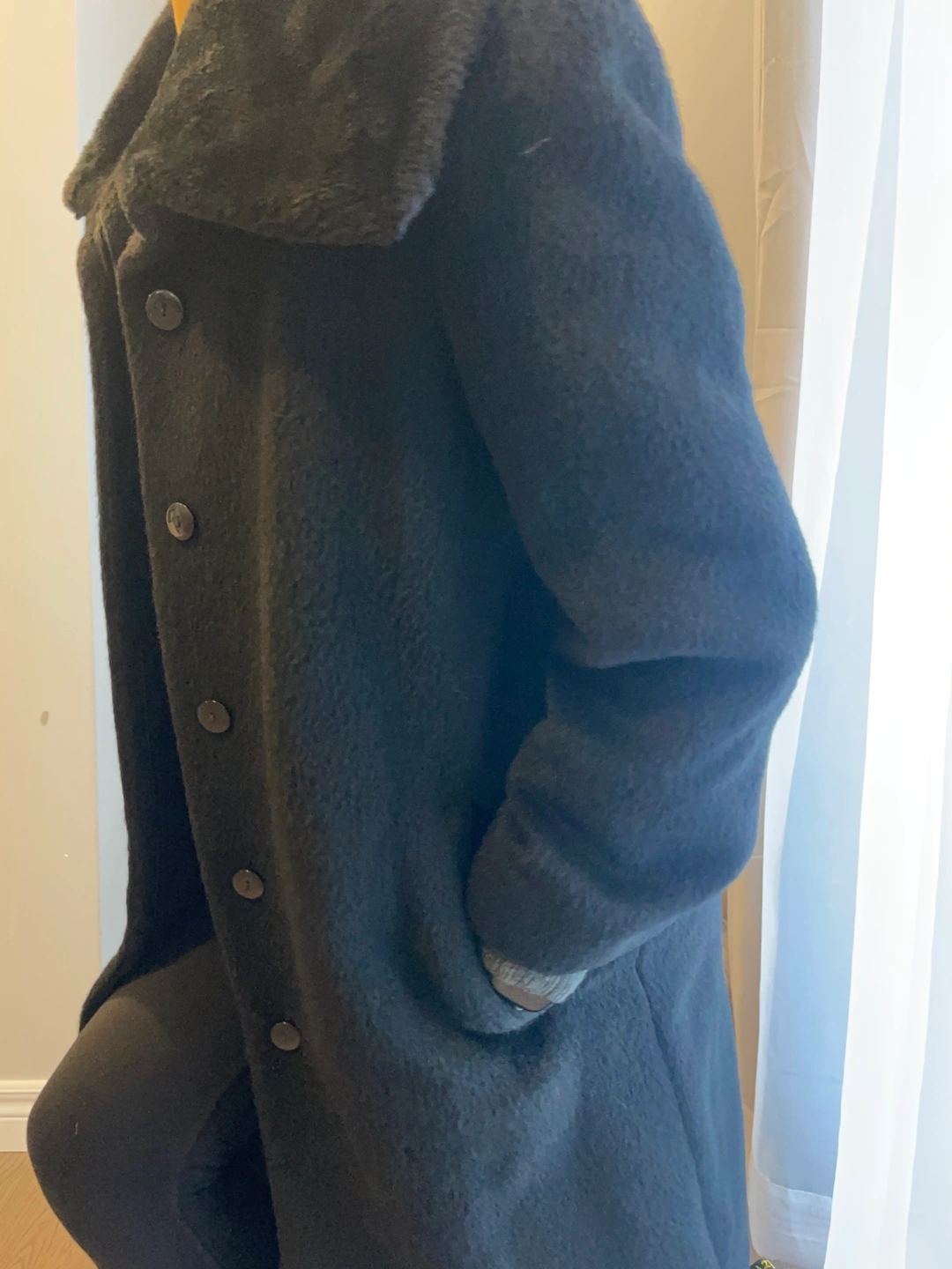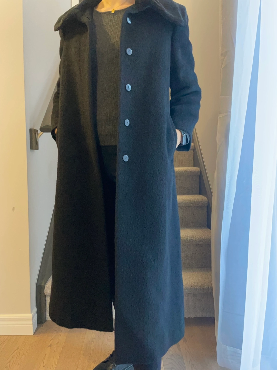 Here's a stylish long black coat, perfect for the colder weather! It has a classic design with a button-up front and a cozy collar. It's made of wool, so it's sure to keep you warm and comfortable