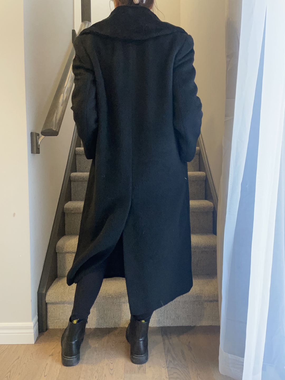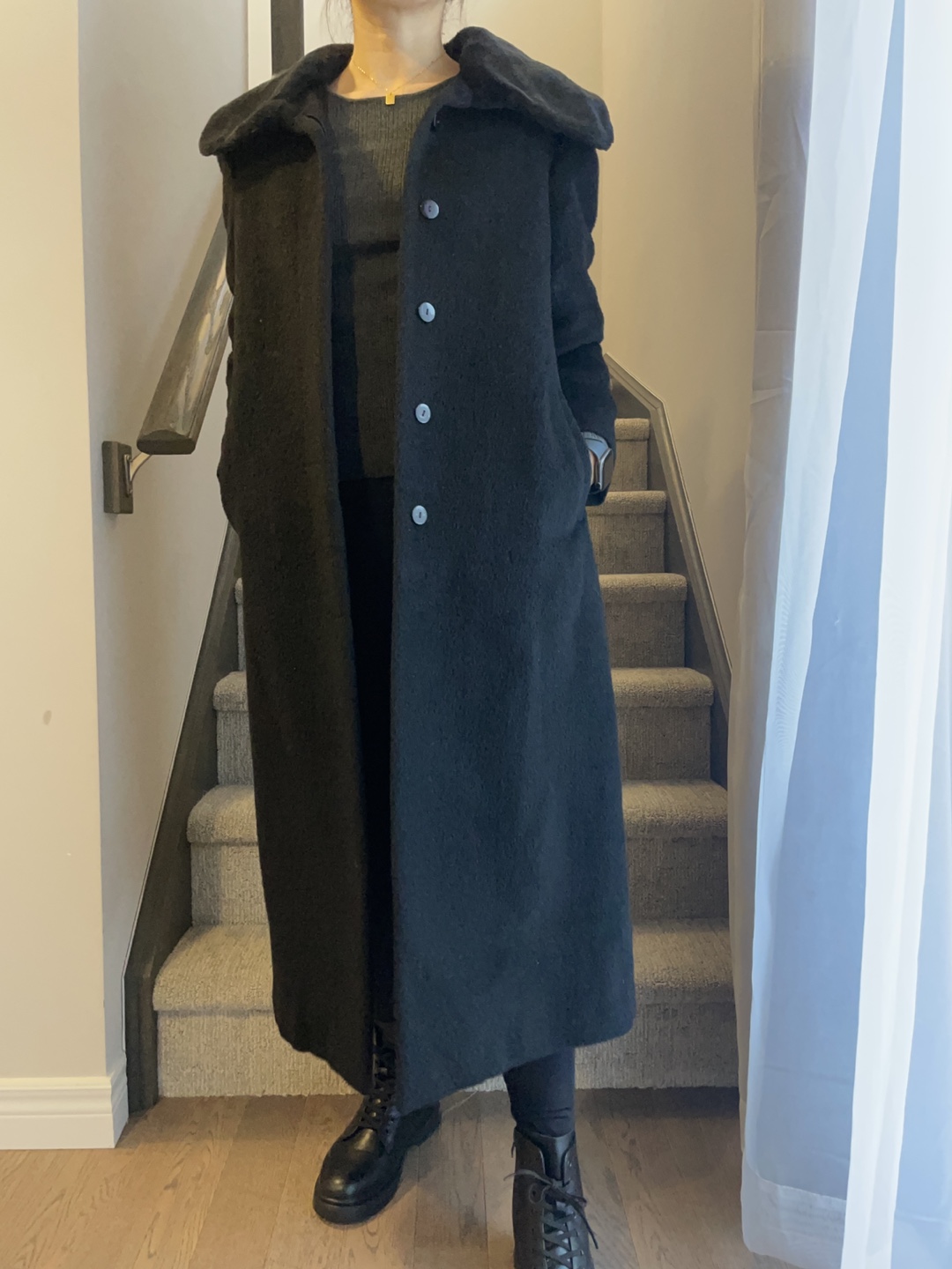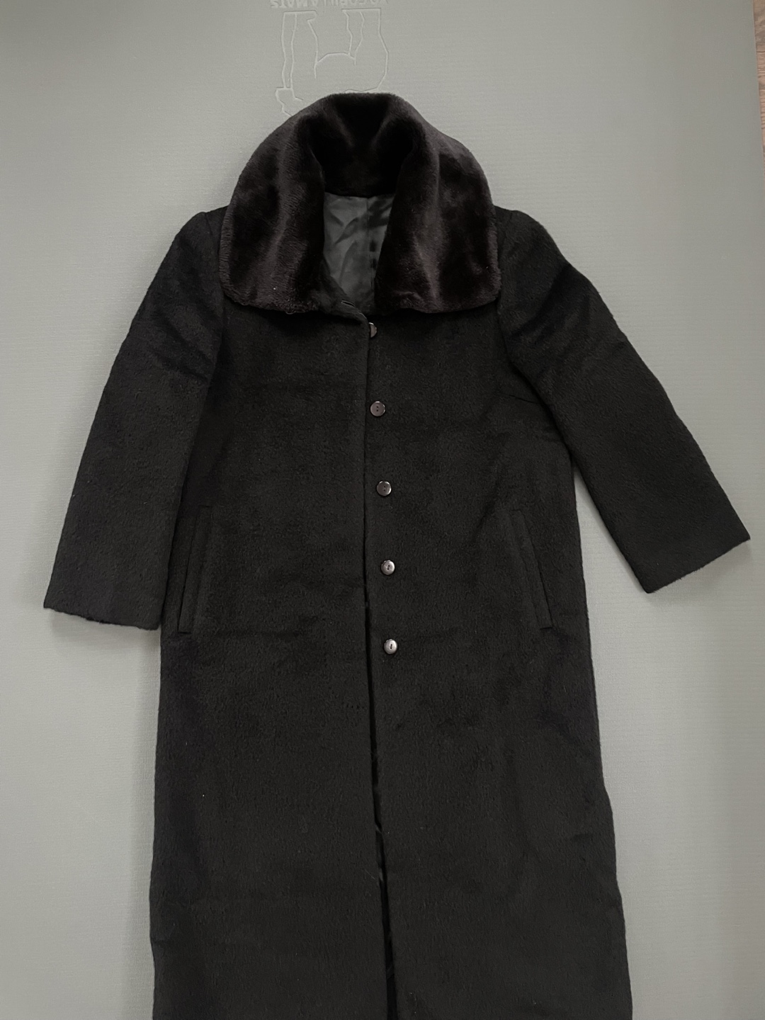 Here's a stylish long black coat, perfect for the colder weather! It has a classic design with a button-up front and a cozy collar. It's made of wool, so it's sure to keep you warm and comfortable