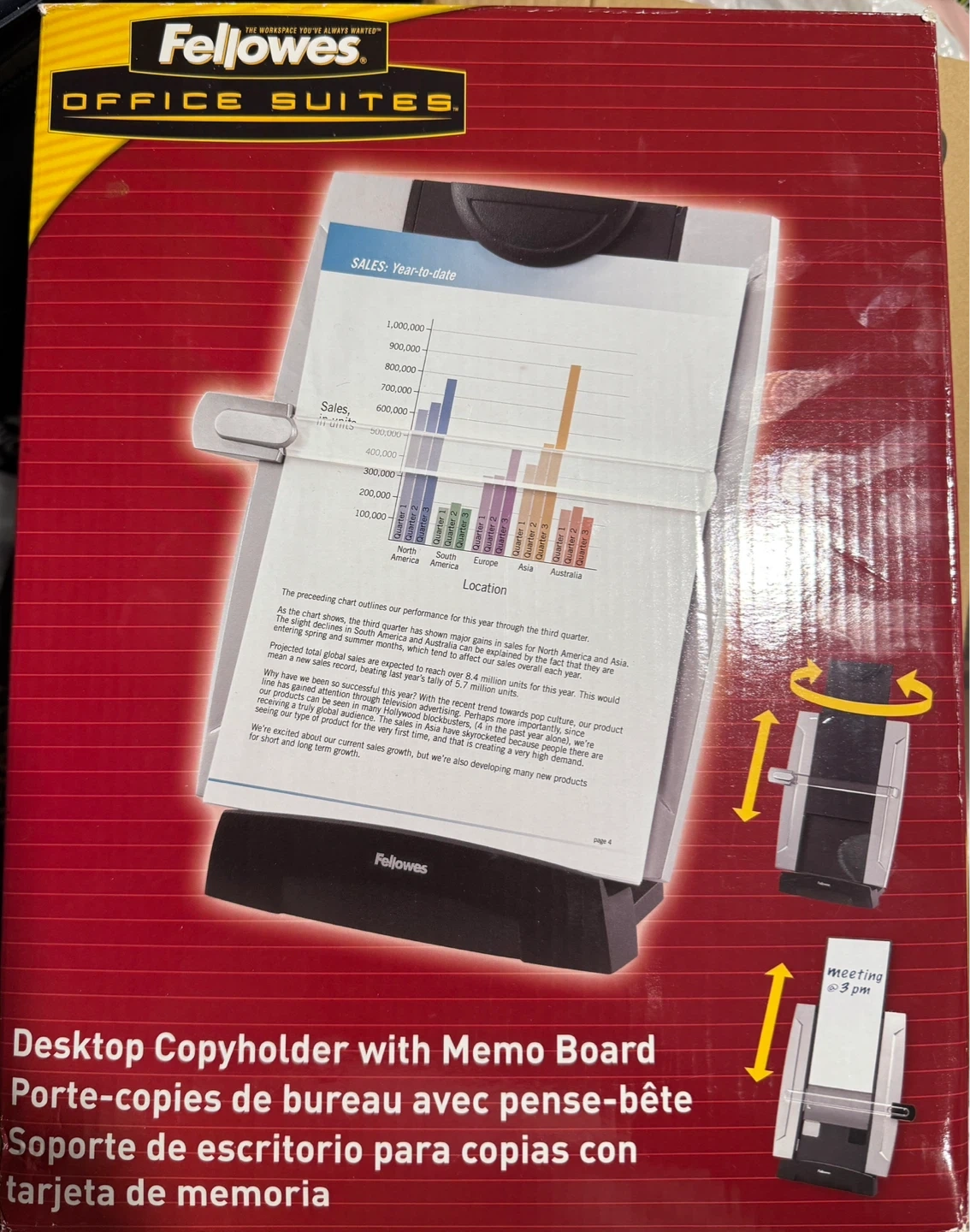 This Fellowes desktop copyholder features a memo board for added functionality. It's designed to hold documents and notes in an upright position. The adjustable angle allows for comfortable viewing.