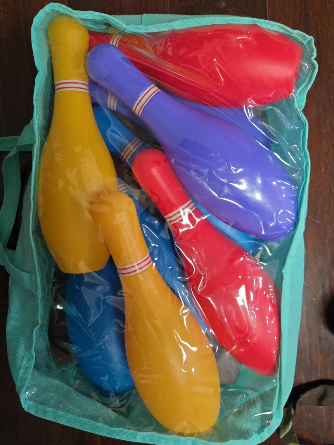Set of colourful toy bowling pins in a convenient carrying bag. Comes with multiple pins in red, yellow, and blue. Perfect for indoor or outdoor play for kids!
