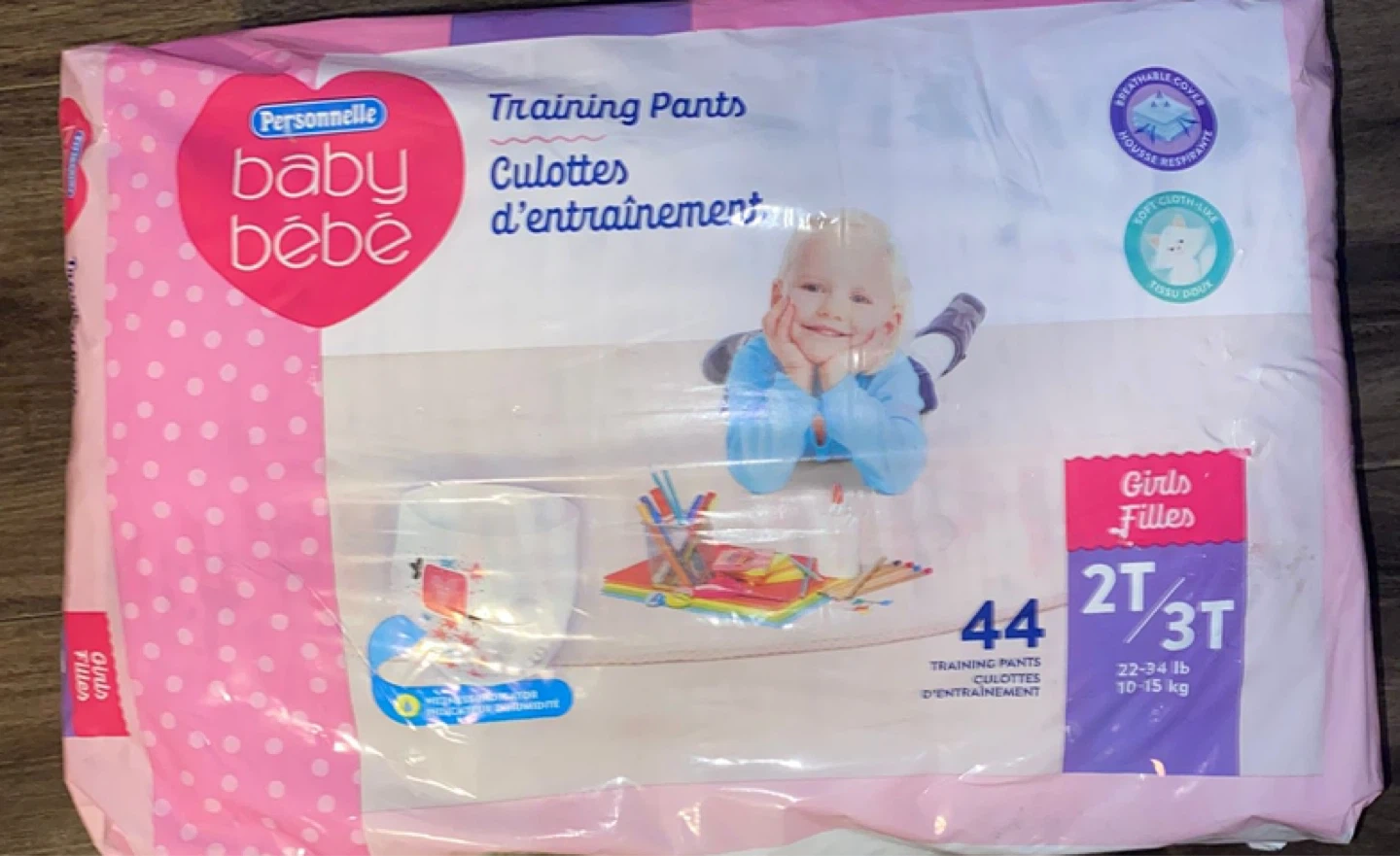 Personnelle Baby training pants in size 2T/3T. This package contains 44 training pants. They have a soft, cloth-like feel and a breathable cover.