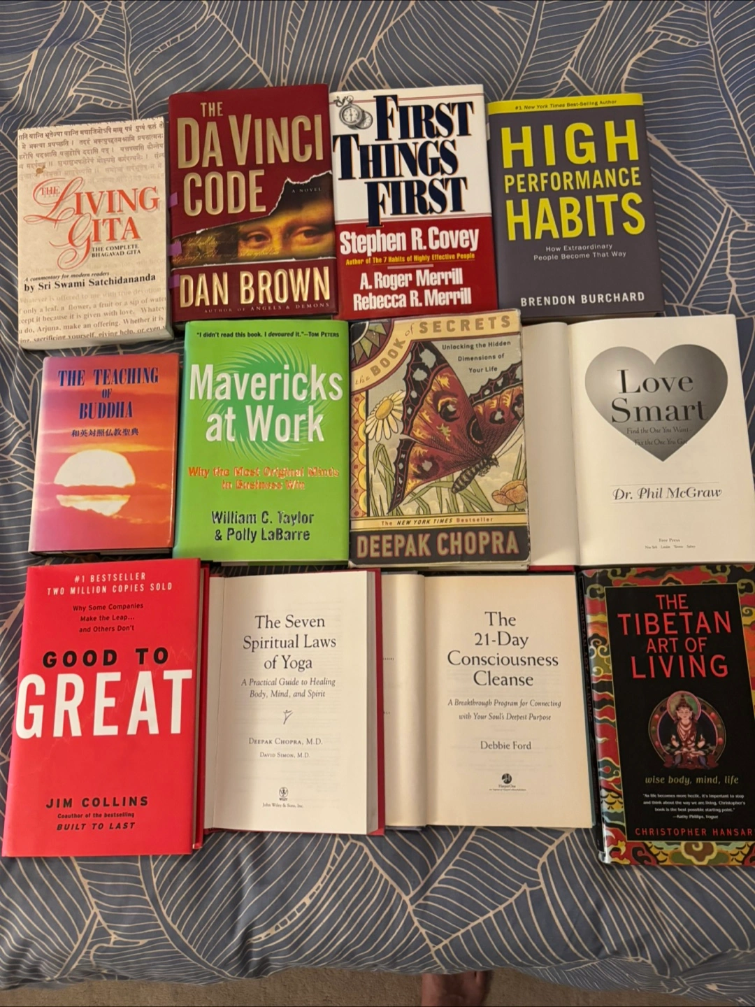 Collection of books including 'The Da Vinci Code', 'First Things First', 'High Performance Habits', and 'Good to Great'. Also features 'The Living Gita', 'The Teaching of Buddha', 'Mavericks at Work', 'The Book of Secrets', 'Love Smart', 'The Seven Spiritual Laws of Yoga', 'The 21-Day Consciousness Cleanse', and 'The Tibetan Art of Living'. Titles cover various topics from fiction to personal development and spirituality.