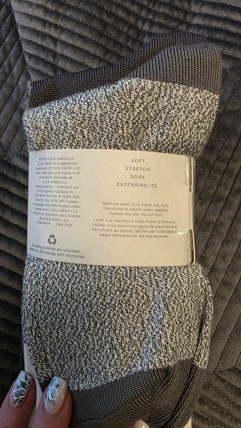 This is a pack of Cole Haan soft stretch socks for women. The size is 4-10. They are made with a blend of materials for comfort. Machine wash cold inside out.