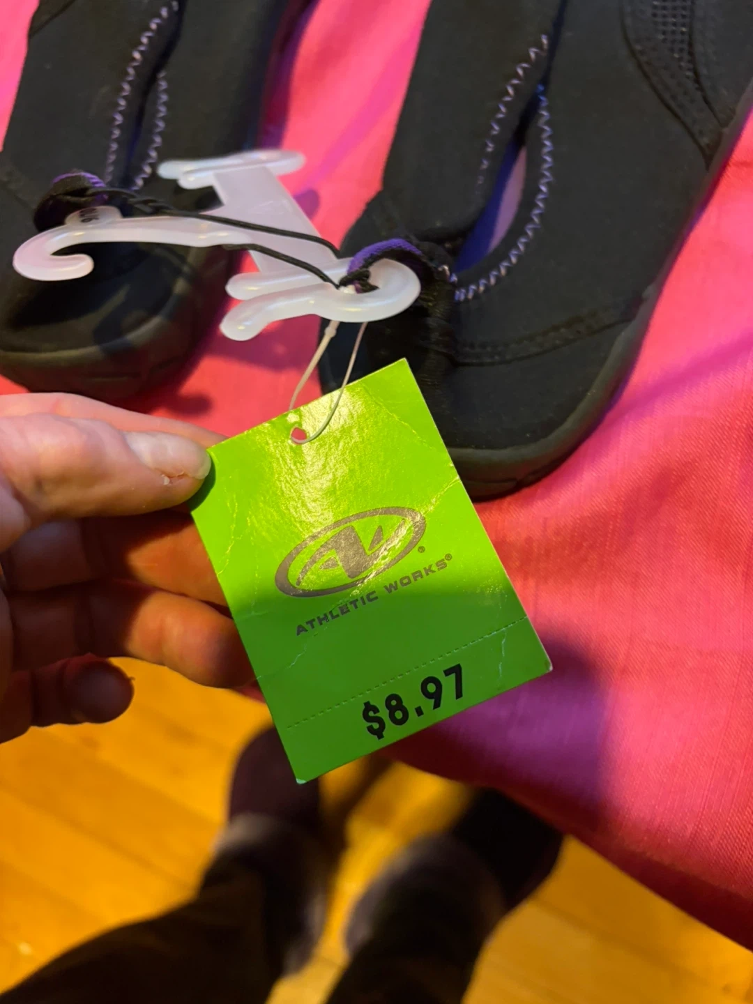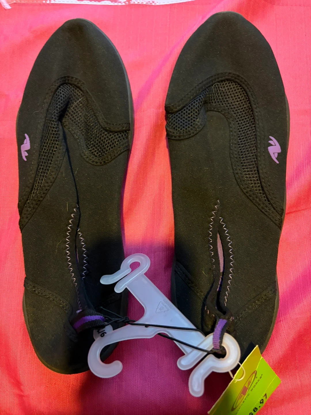 These black water shoes are from Athletic Works in size L (9/10). They're made of neoprene-like material with mesh panels for breathability. The flexible rubber sole offers good traction.