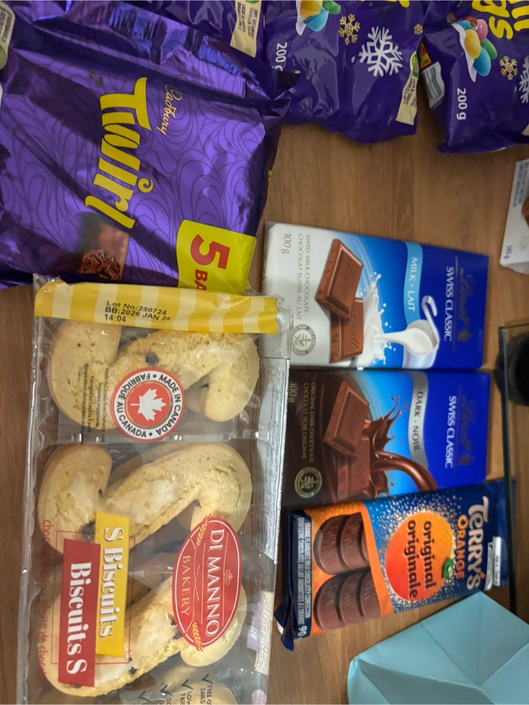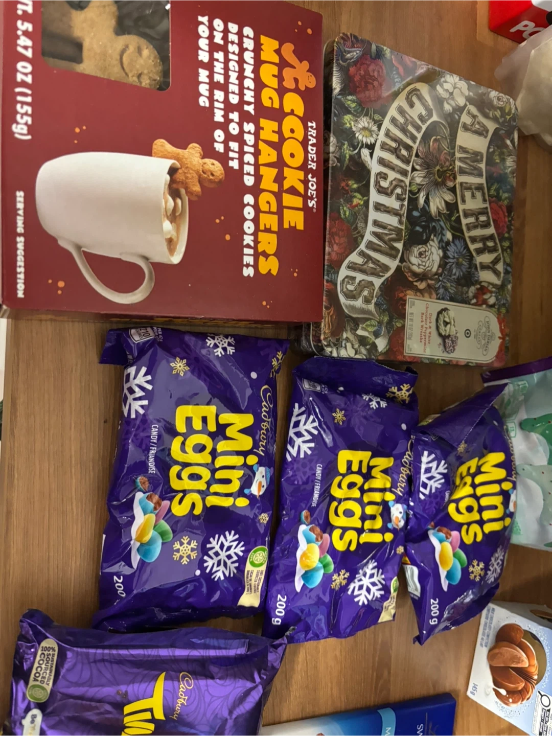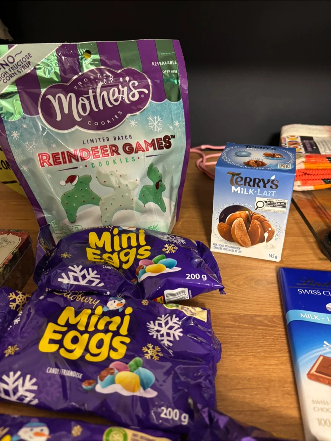 Assorted Cadbury Mini Eggs, Lindt Swiss Classic bars, Terry's Chocolate Orange, and other holiday treats. Includes cookie mugs hangers and Mother's Cookies Reindeer Games.