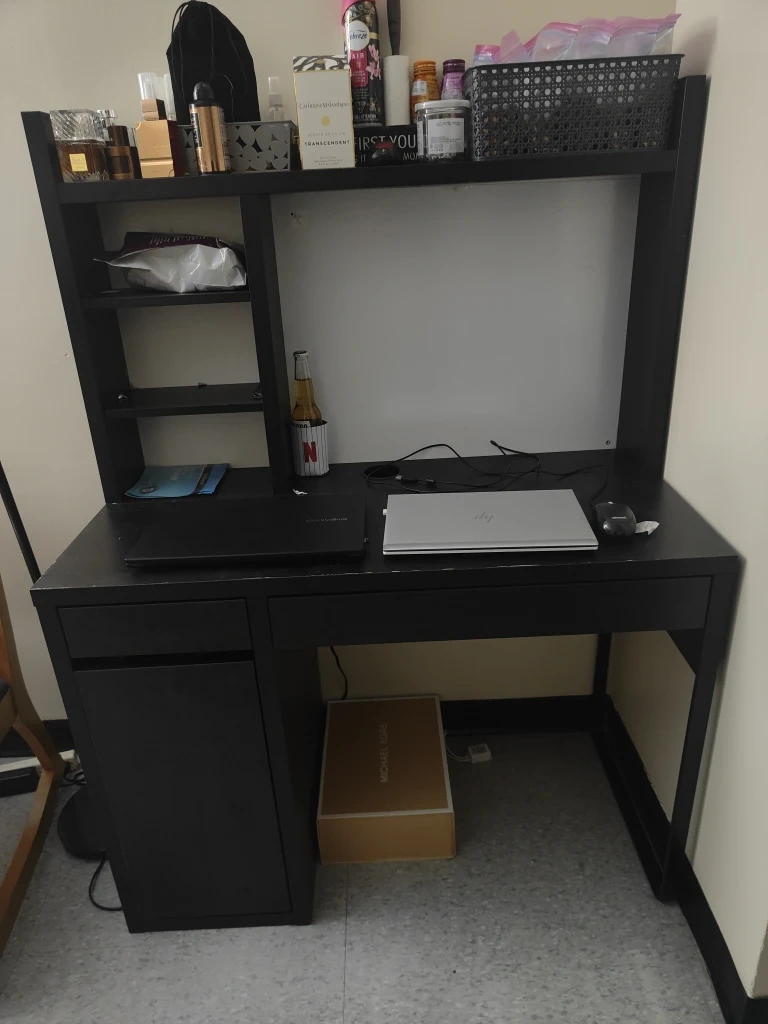 Selling my IKEA MICKE desk in black-brown. It’s a great, compact desk perfect for a home office or student setup. The desk is in good condition overall, with some minor chips here and there from normal use.