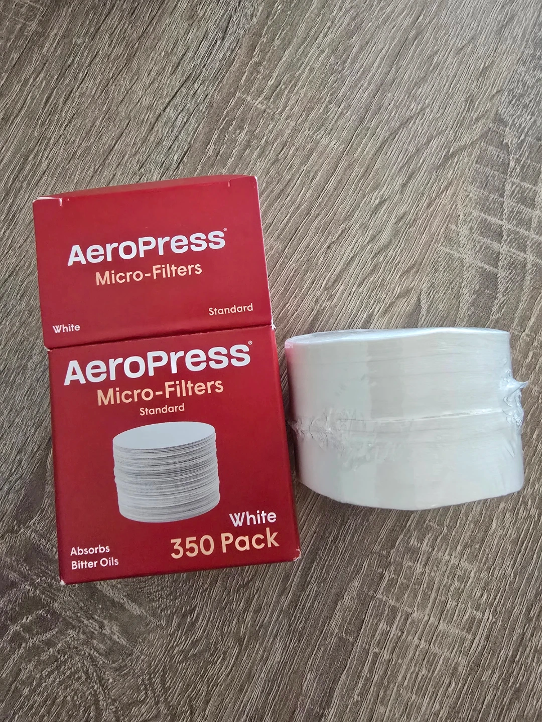 A sealed box of AeroPress Standard Micro-Filters in white. It contains 350 paper filters. These filters absorb bitter oils from your coffee brew. Perfect for regular AeroPress users!