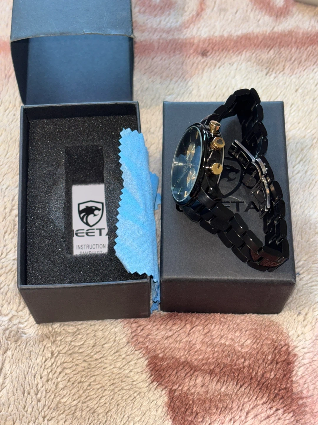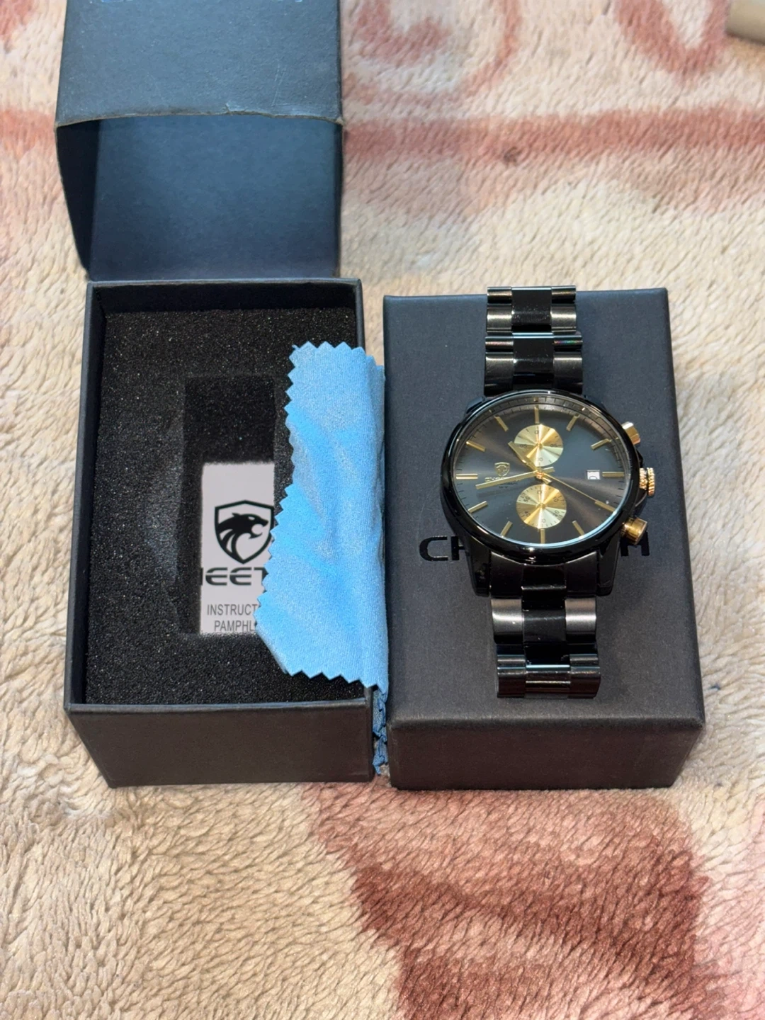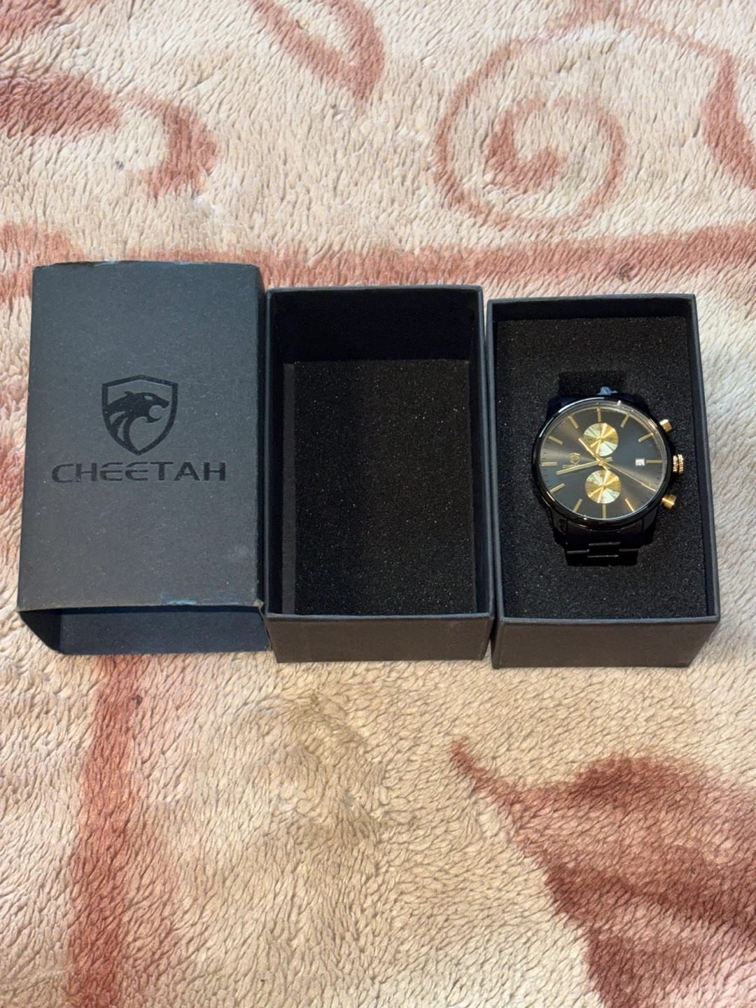 This Cheetah watch features a black stainless steel band and case with gold accents on the dial. It's a chronograph model with quartz movement. Includes the original box, instruction pamphlet, and a cleaning cloth.