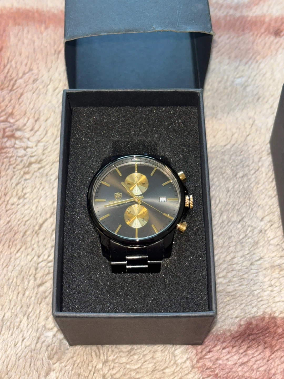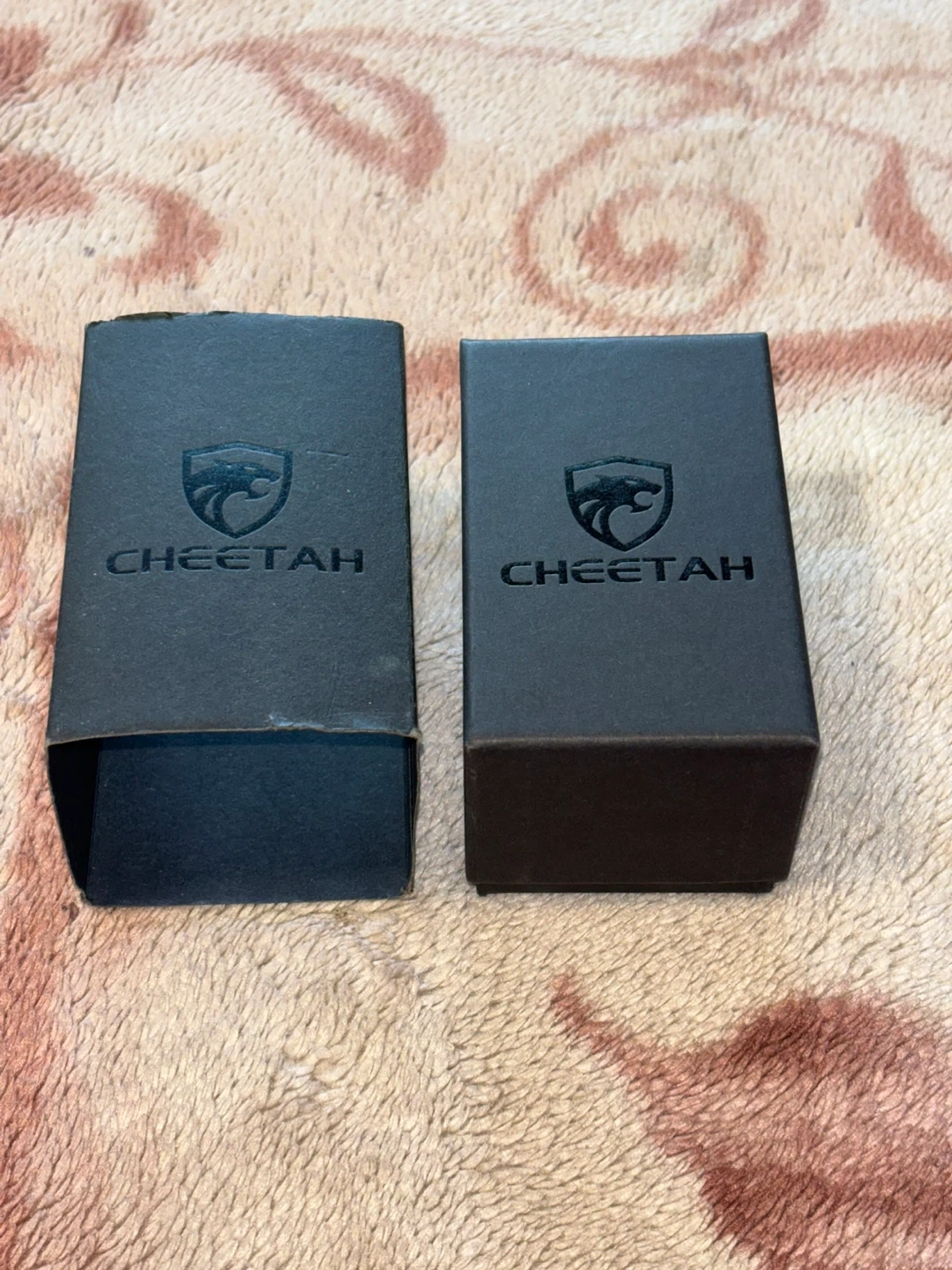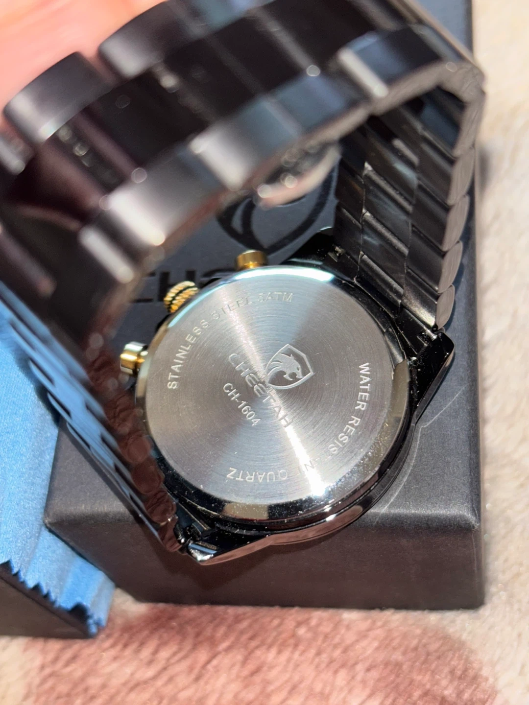 This Cheetah watch features a black stainless steel band and case with gold accents on the dial. It's a chronograph model with quartz movement. Includes the original box, instruction pamphlet, and a cleaning cloth.