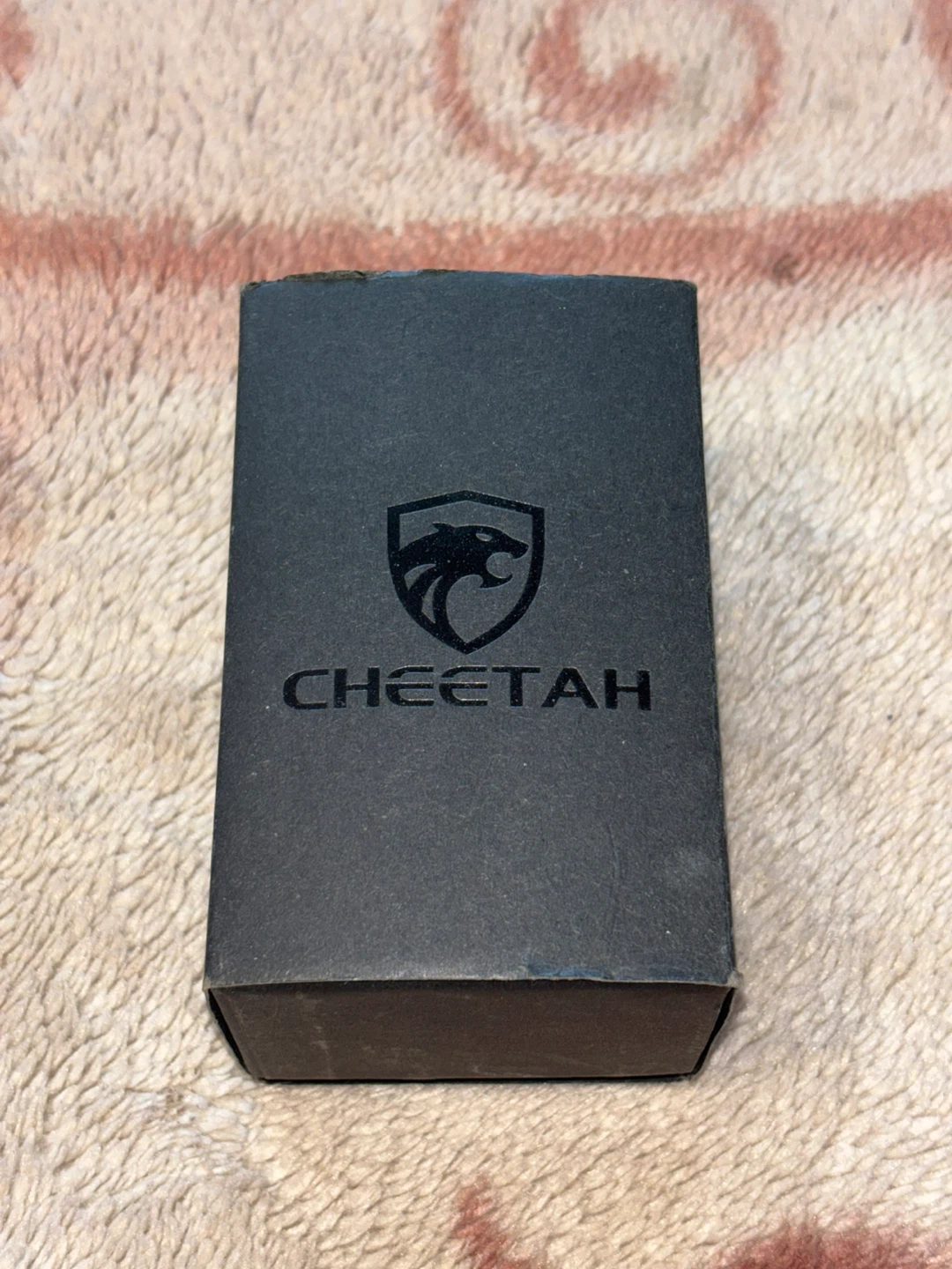 This Cheetah watch features a black stainless steel band and case with gold accents on the dial. It's a chronograph model with quartz movement. Includes the original box, instruction pamphlet, and a cleaning cloth.
