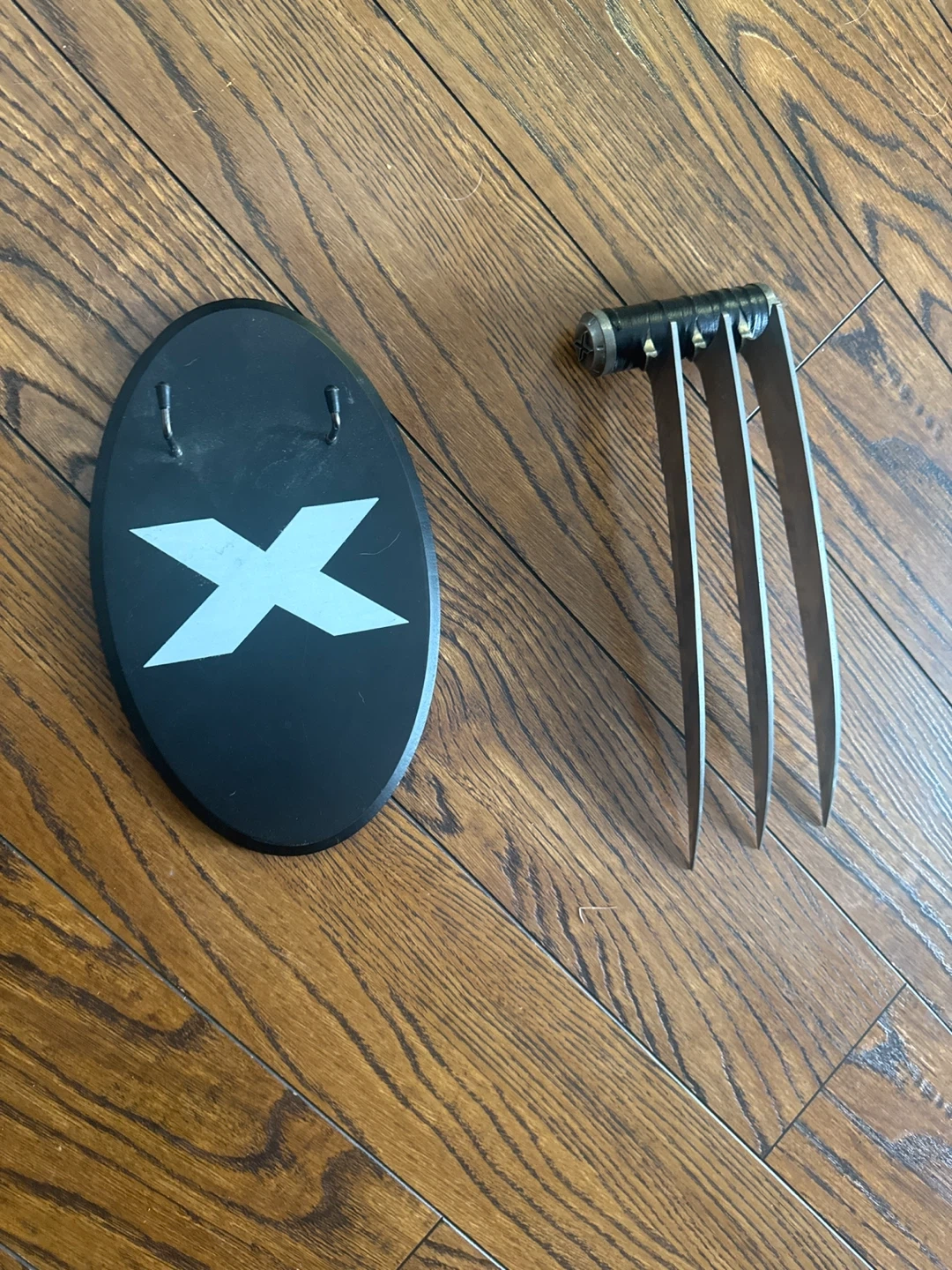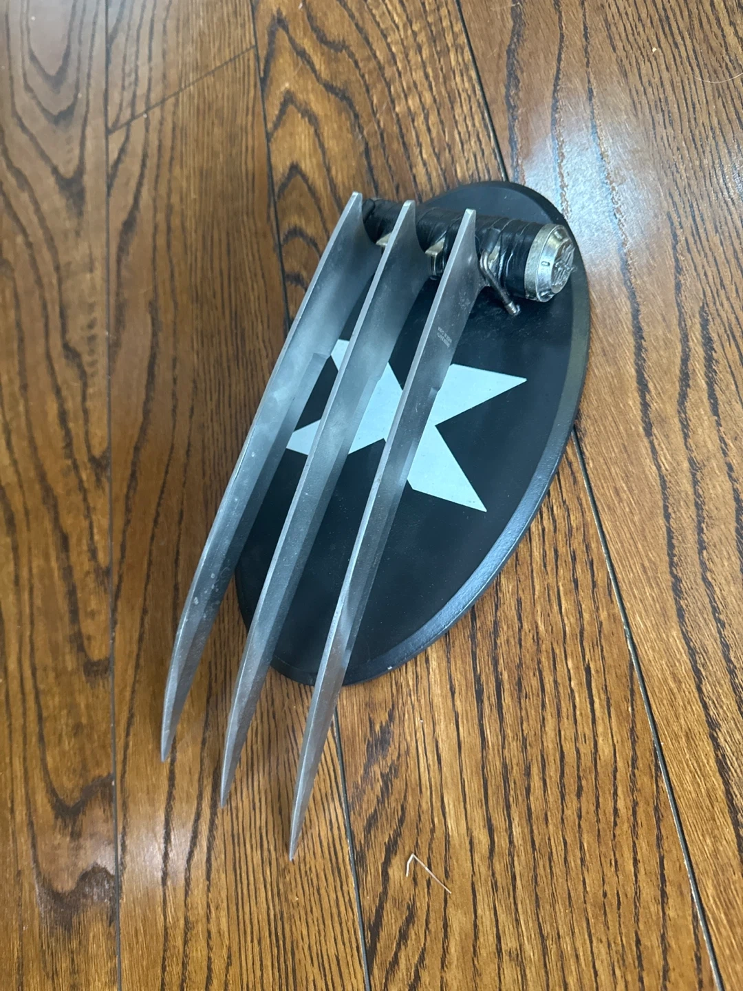 Replica Wolverine adamantium claws with an 'X' emblem display stand. These are a cool prop for any Marvel fan's collection. Made from metal with a black base.