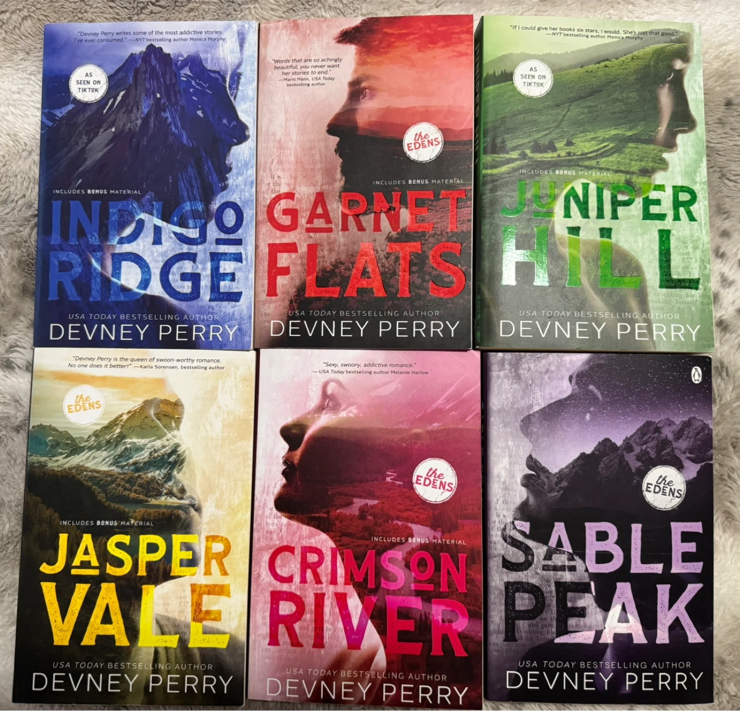 Six USA Today Bestselling romance novels from Devney Perry's The Edens series. Includes Indigo Ridge, Garnet Flats, Juniper Hill, Jasper Vale, Crimson River, and Sable Peak. These paperbacks offer bonus material inside.