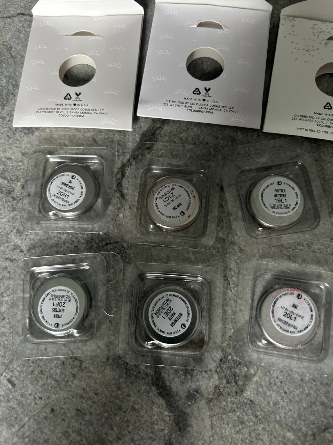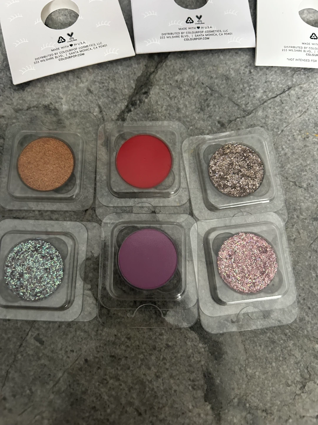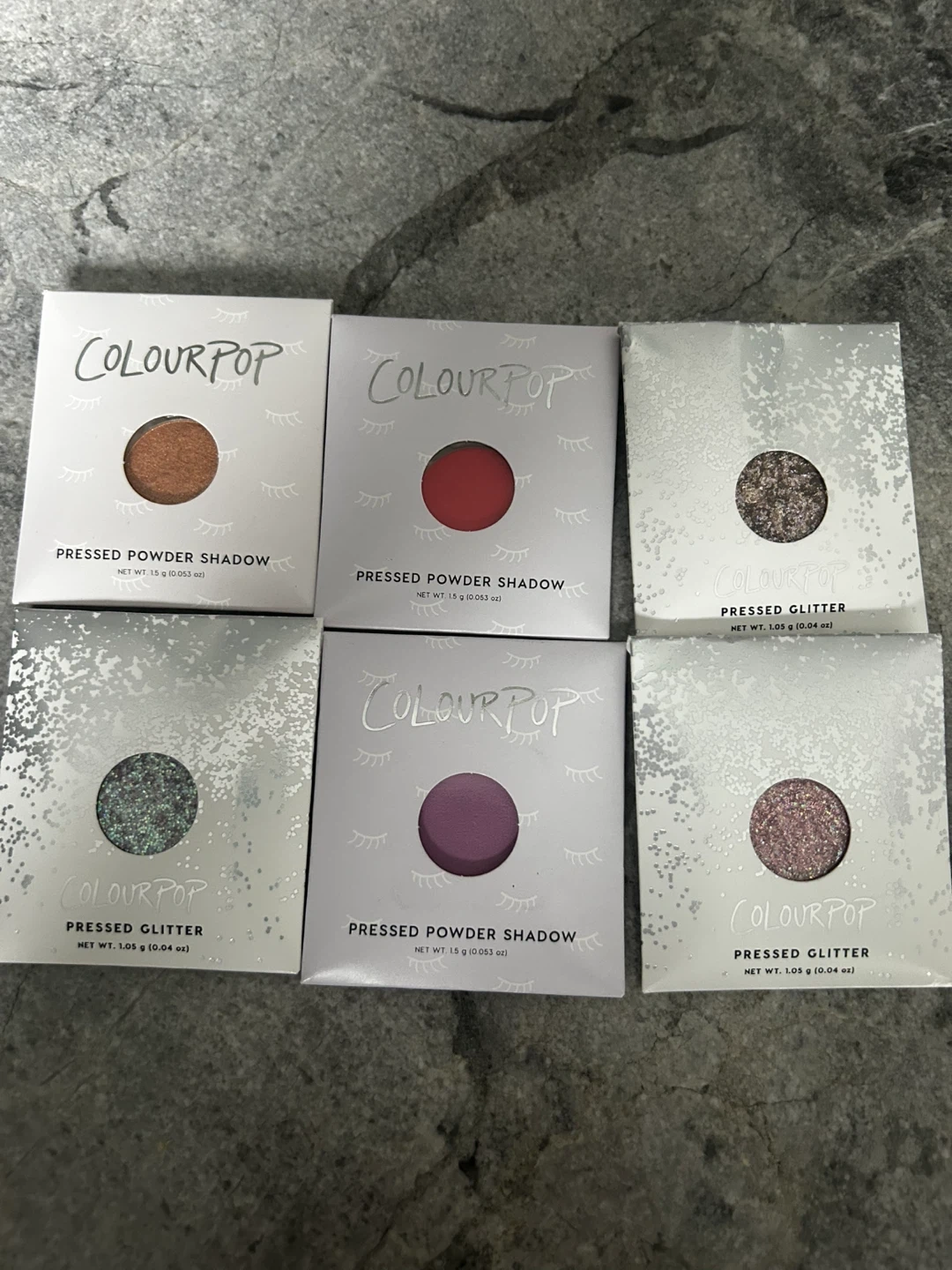 This listing includes six ColourPop pressed powder shadows and glitters. Items are individually packaged and ready for use. They're perfect for creating a variety of makeup looks!