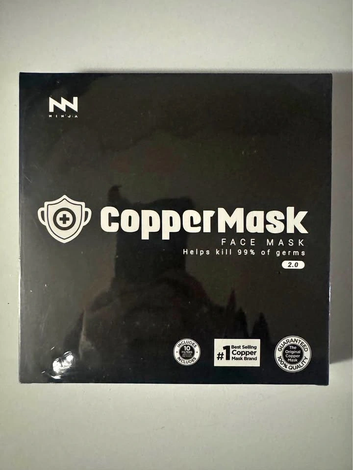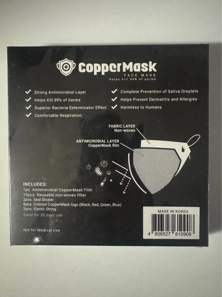 Pickup at Bathurst and Centre or Yonge and Steeles. Cash only please! :) This is a new CopperMask face mask with an antimicrobial layer that helps kill 99% of germs. It comes with 1pc antimicrobial copper mask film, 10 reusable non-woven filters, 2 seal stickers, 8 colored copper mask logos, and 2 elastic strings.