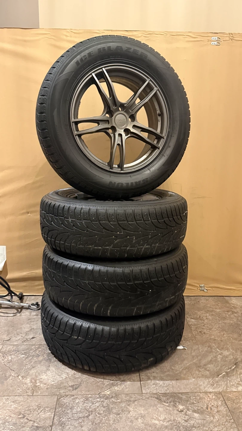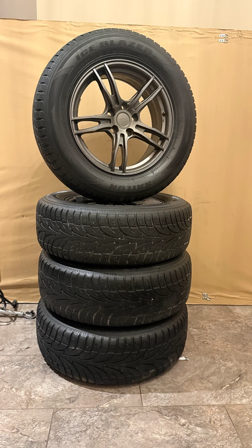 Four envy rims 5x114.3 Plus 225/65R17 Sailun Ice Blazer Winter tires mounted on alloy rims. These are winter tires and ready for the season. Tread depth appears good on all tires. Full set of 4