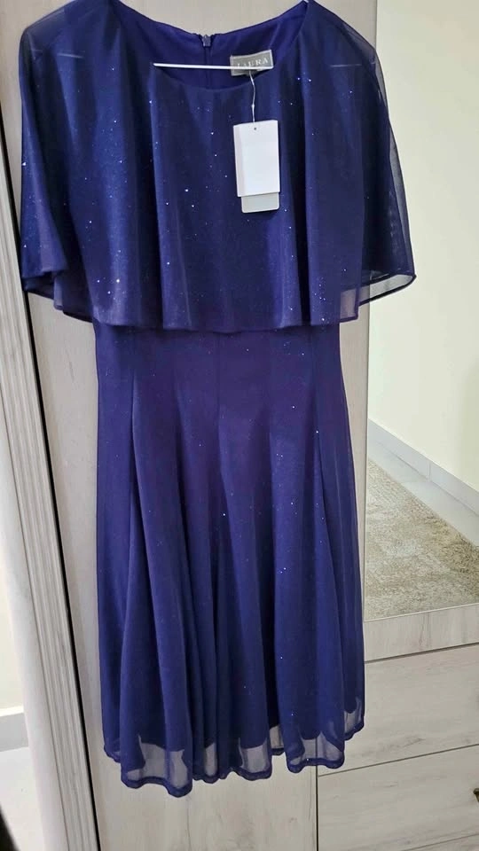 Beautiful navy blue dress with sheer overlay and sparkles. Has a zipper closure at the back. Still has tags attached, never worn.