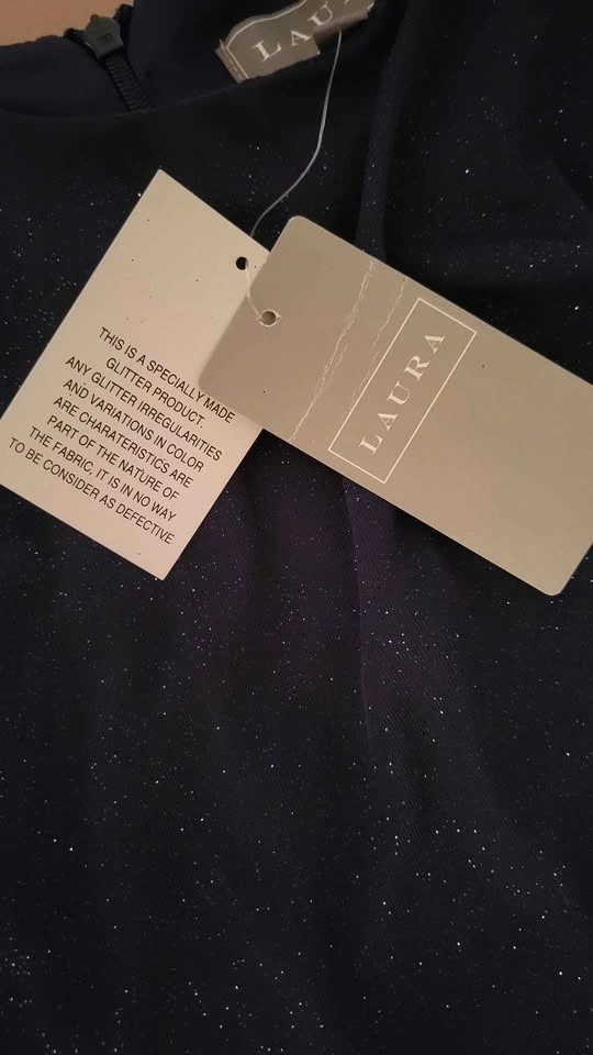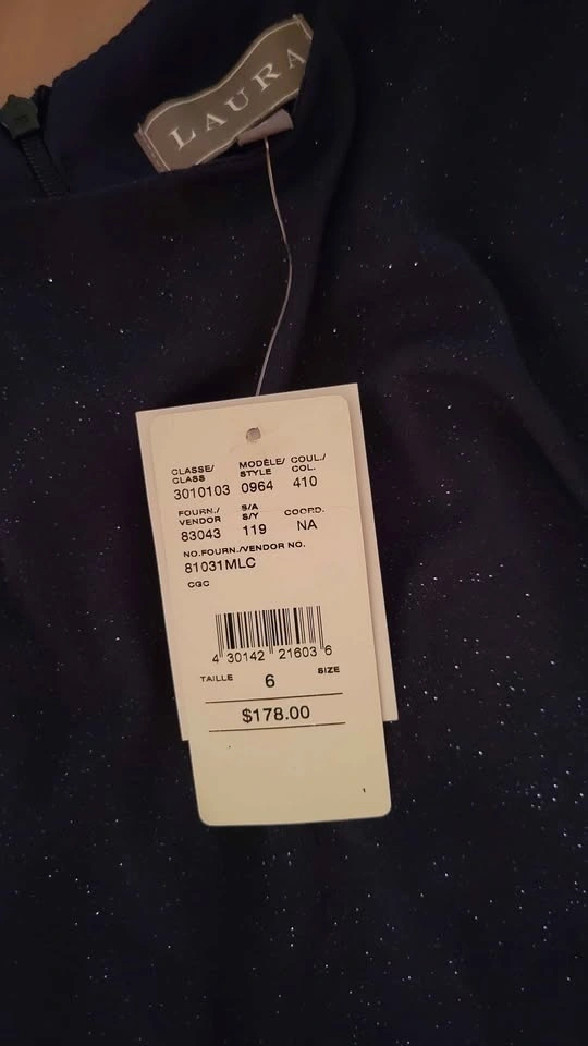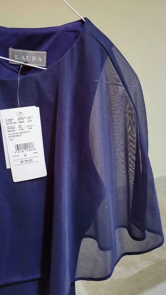 Beautiful navy blue dress with sheer overlay and sparkles. Has a zipper closure at the back. Still has tags attached, never worn.