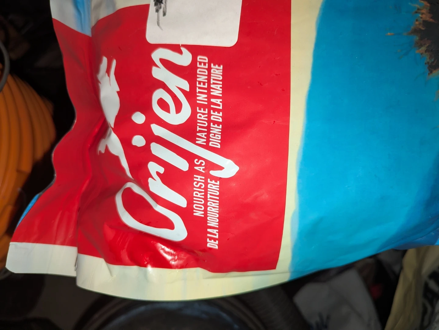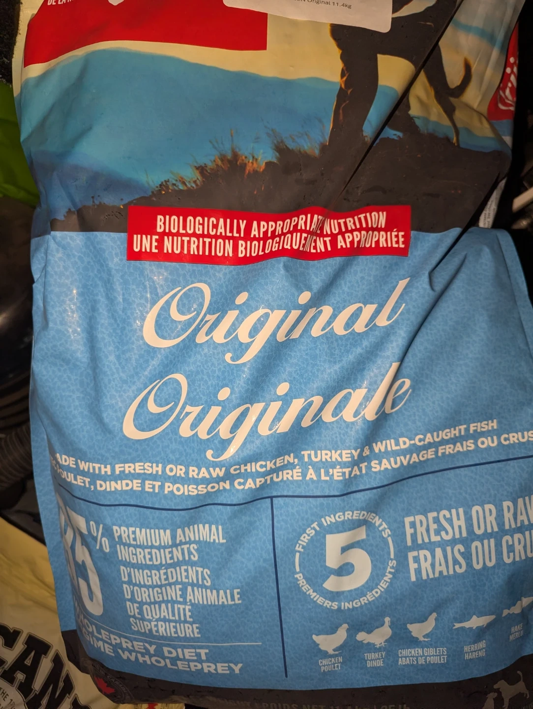 Selling a bag of Orijen Original dog food! It's designed to nourish your dog as nature intended. It features biologically appropriate nutrition with fresh or raw chicken, turkey, and wild-caught fish. The top 5 ingredients are fresh or raw, ensuring a high-quality diet for your furry friend