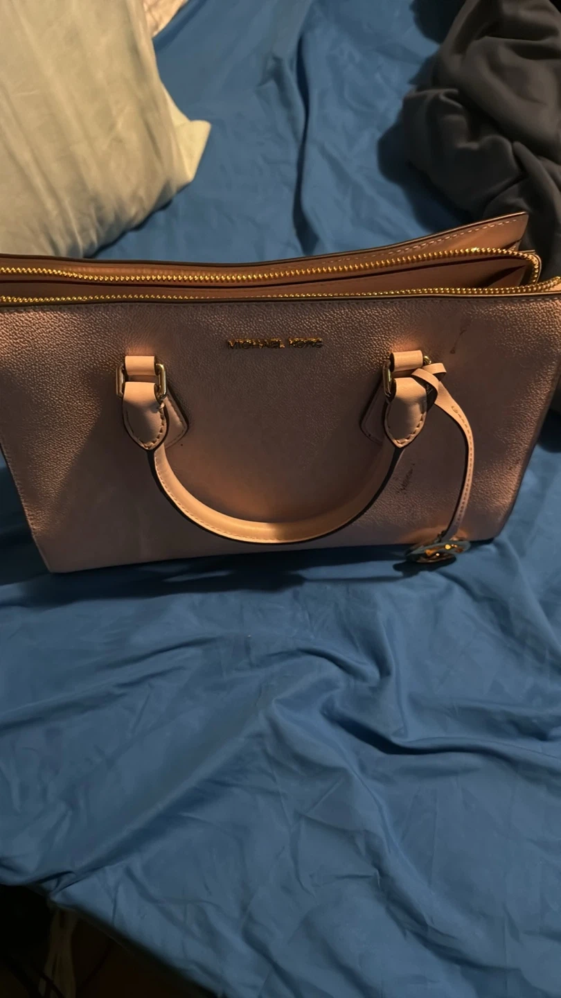 Pink leather satchel handbag by Michael Kors. It features a pebbled texture and gold-tone hardware. This bag has top handles and a zip-top closure.