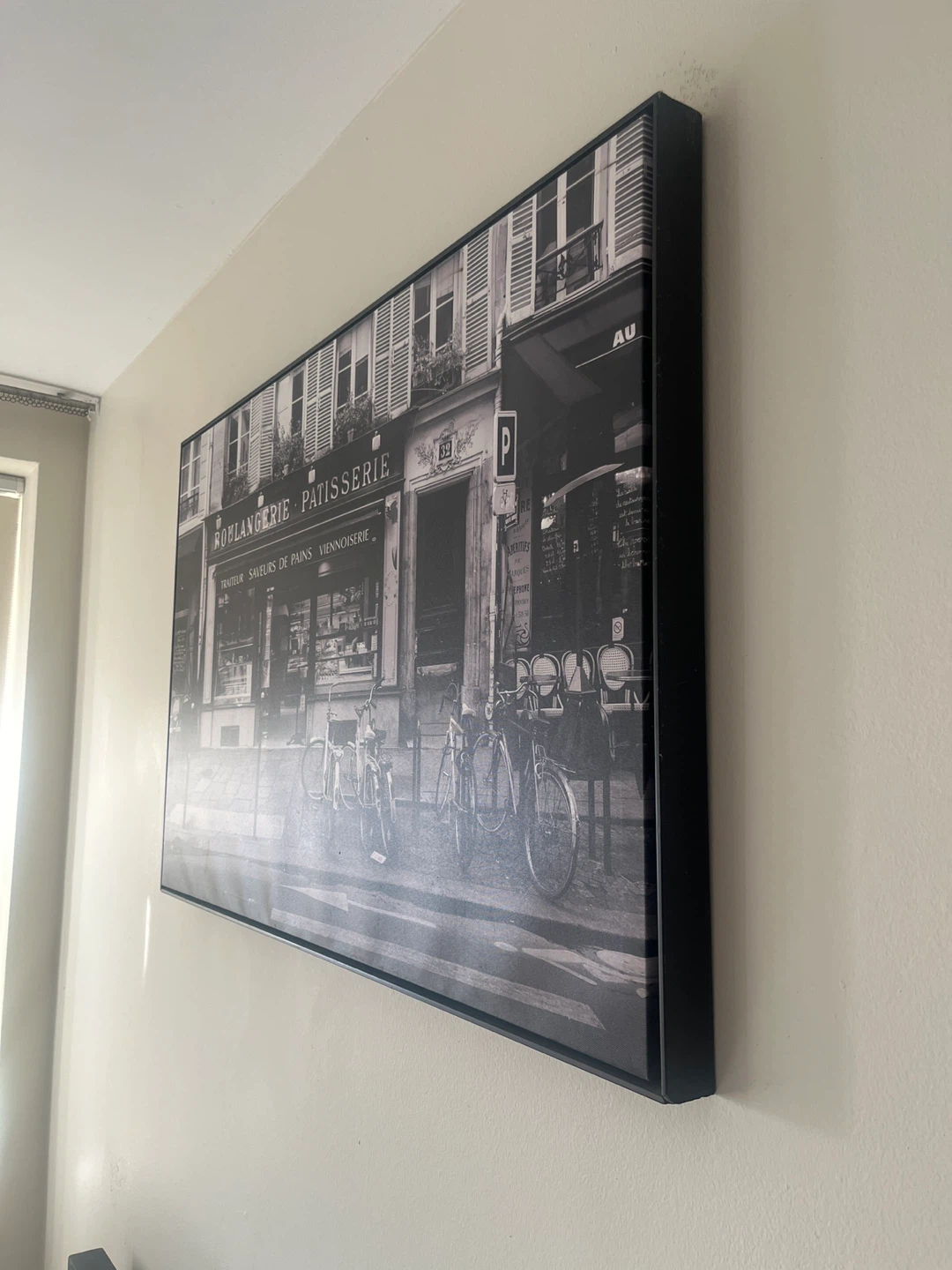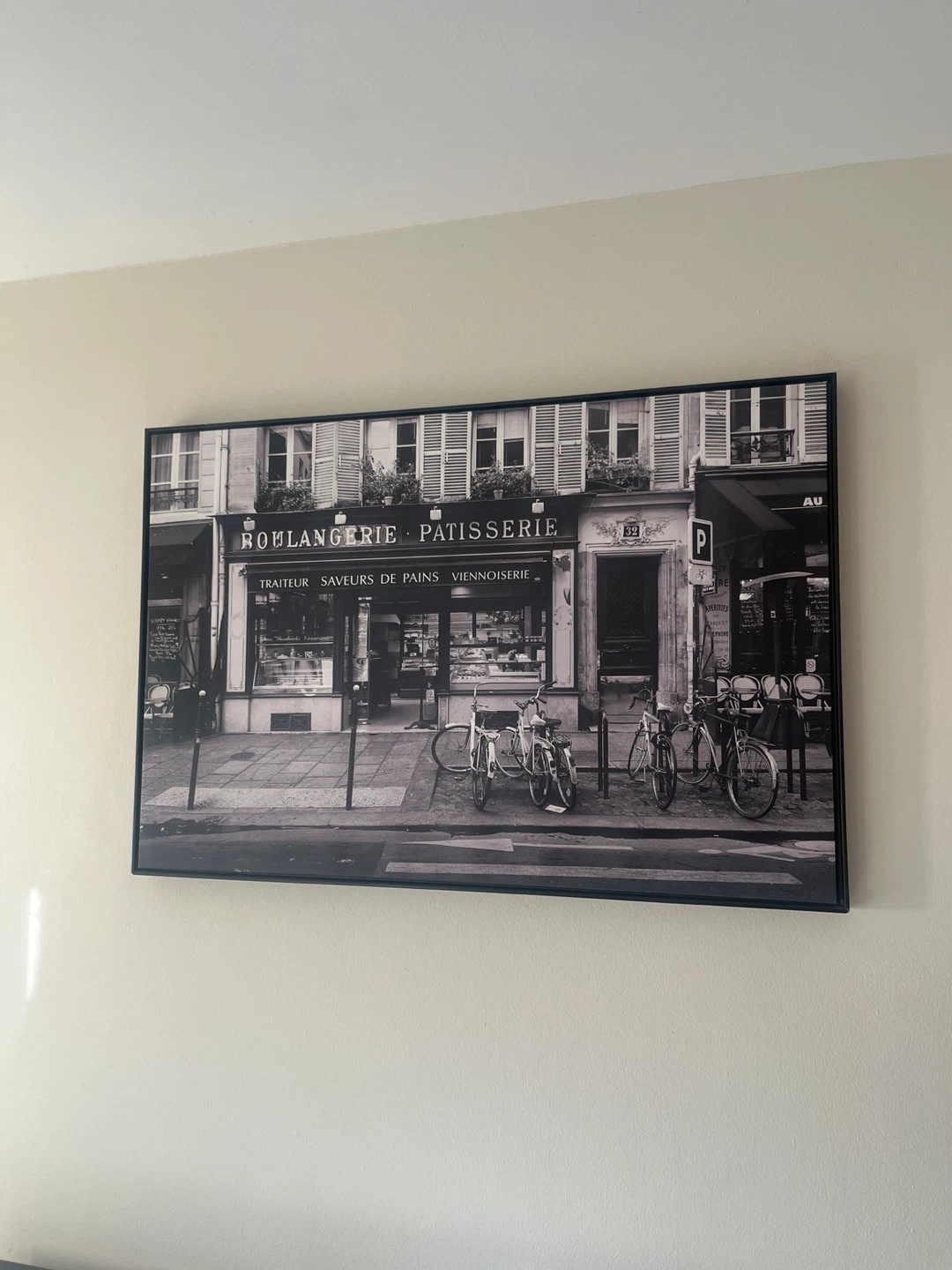This framed wall art depicts a charming black and white scene of a boulangerie and patisserie in Paris. It features bicycles parked out front and a classic European building facade. It's a great piece to add a touch of Parisian flair to any room!