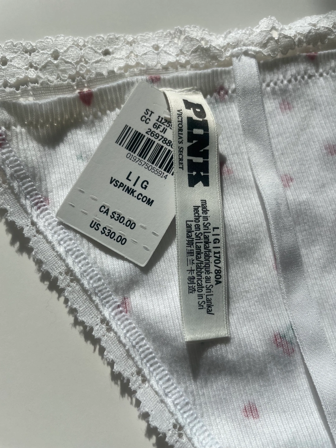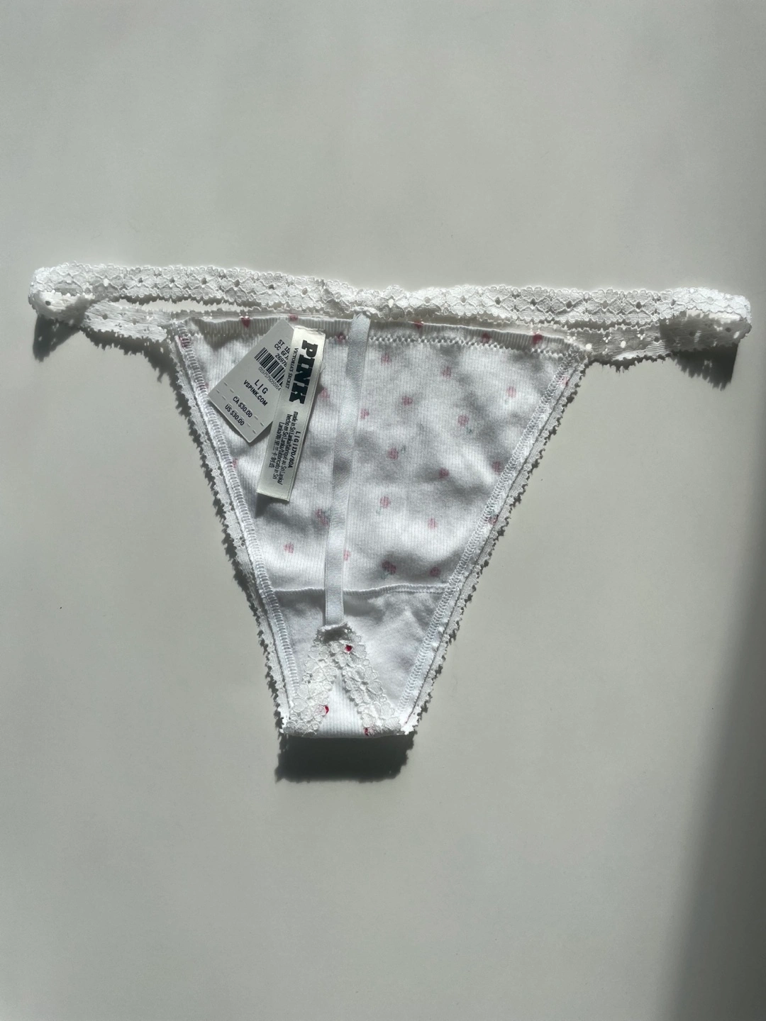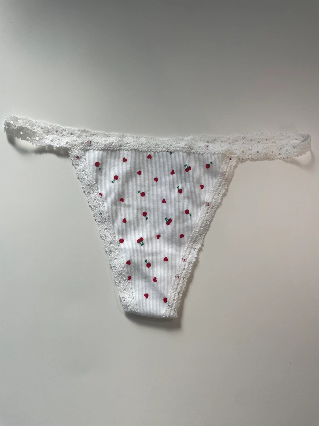 White ribbed thong. Cherry and heart print. Lace trim. Size large.