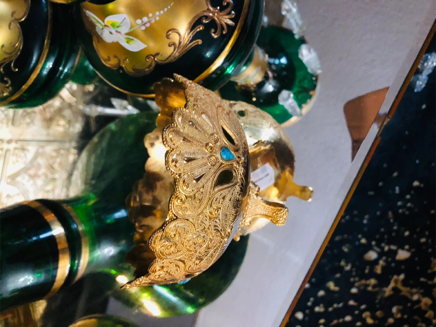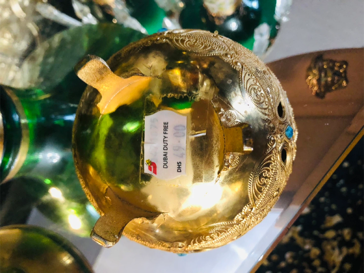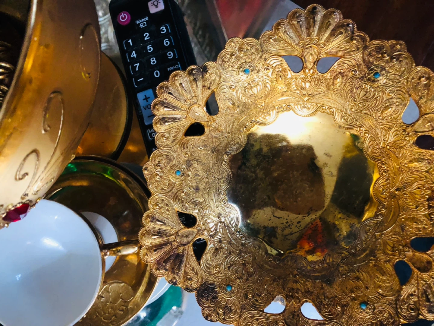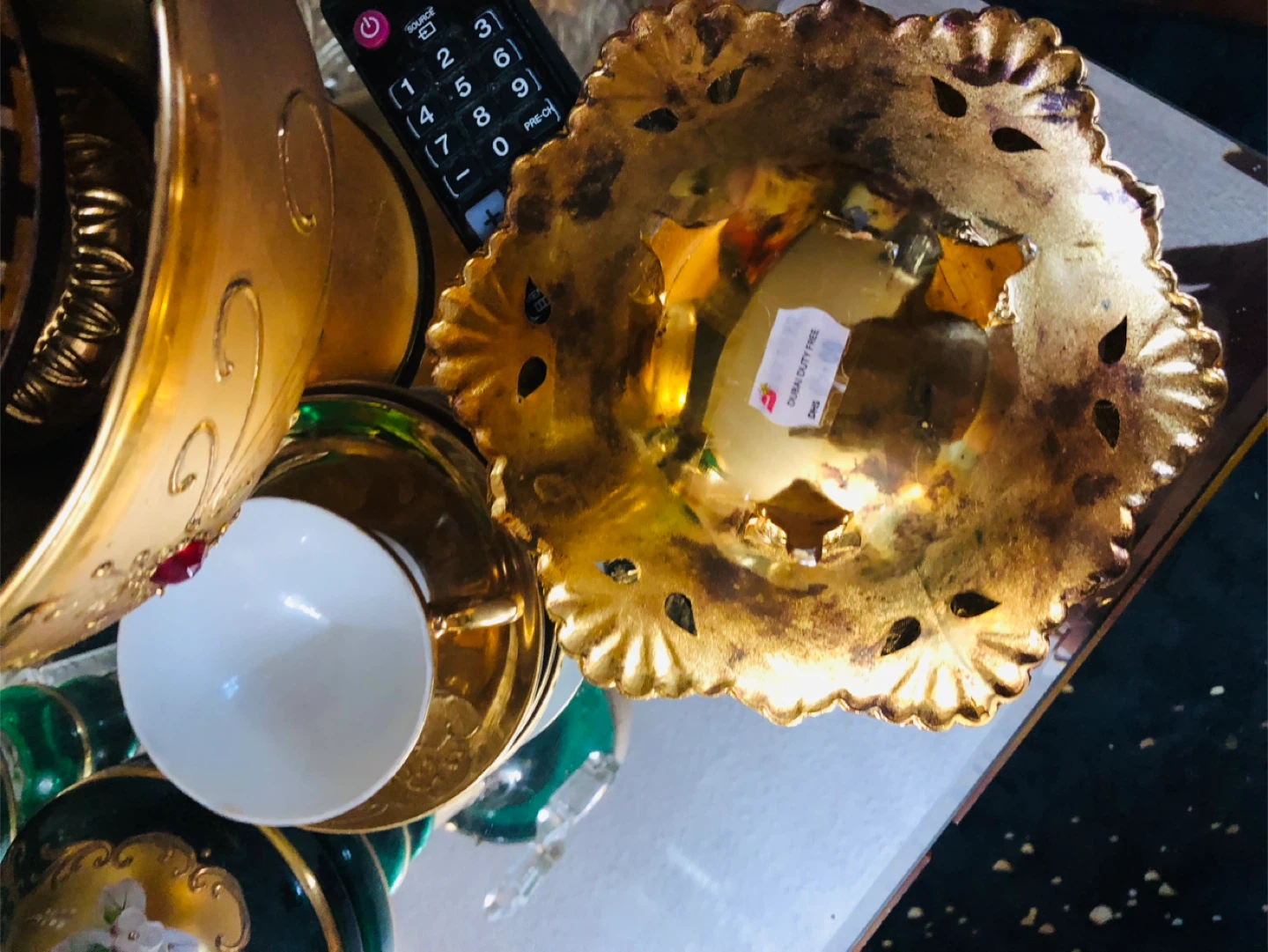 Decorative gold-toned metal bowl with intricate detailing and blue accents. It's suitable for holding small items or as a centrepiece. This decorative bowl features ornate scrollwork and a scalloped edge.