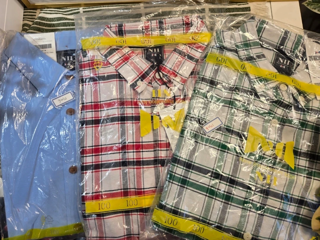 Three NII Men's' plaid shirts are still in their original packaging. Includes one light blue solid shirt and two plaid shirts in red/black and green/white patterns. Size 100.