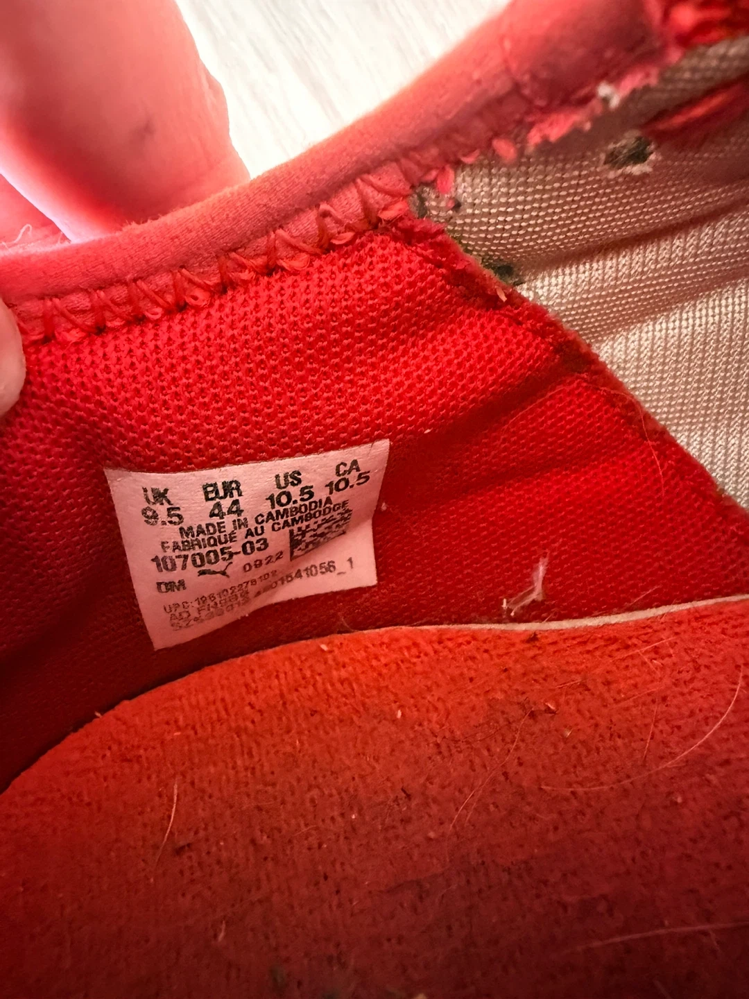 These are Puma soccer cleats in a bright orange colour. They're a US men's size 10.5, EU 44, UK 9.5, and CA 10.5. Cleats are designed for performance on the field.