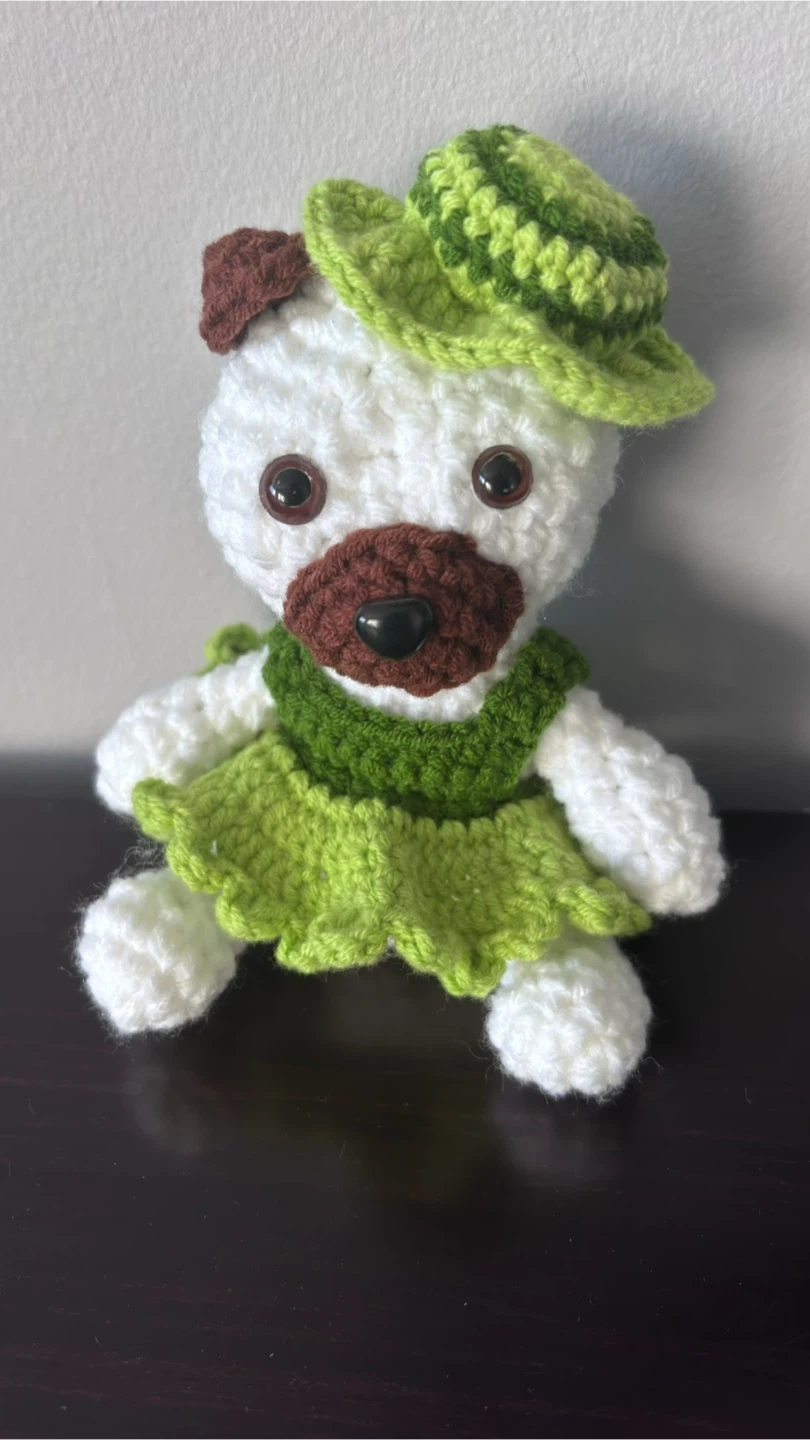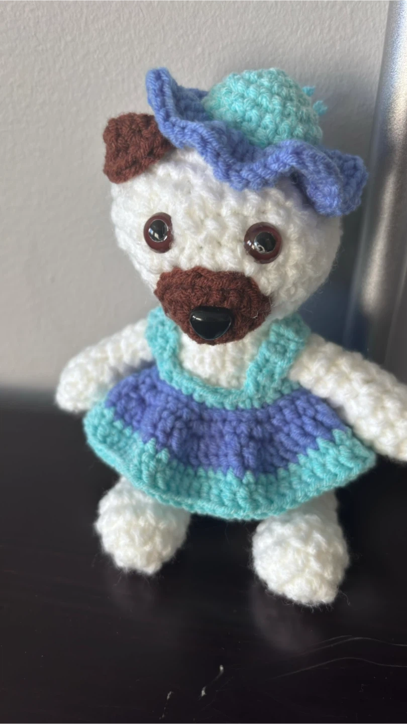 Set of five adorable crochet teddy bears, each with a unique, colourful handmade outfit and hat. These charming little bears are perfect for decoration or as a special gift for someone who loves handmade items. Made from soft yarn.