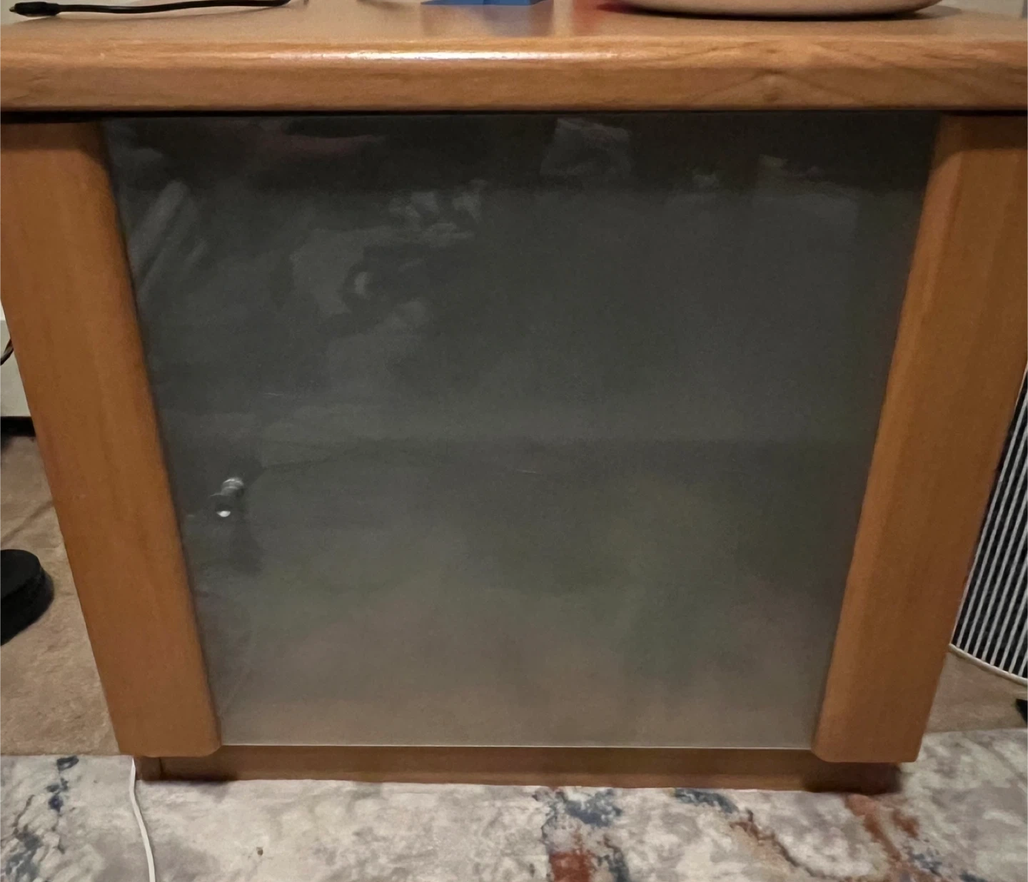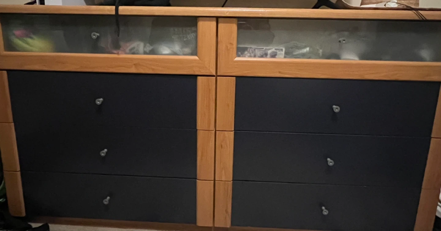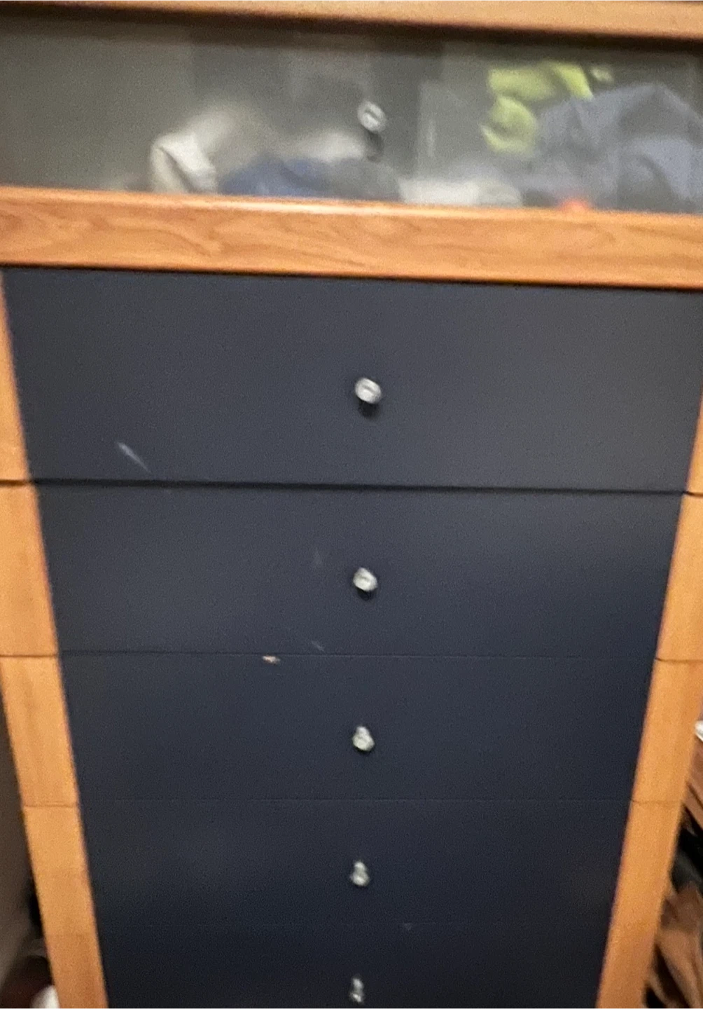 FREE wood and blue dresser, chest and nightstand. It has a unique design with glass cabinet doors on top and several drawers below. It's in good condition and ready for a new home!