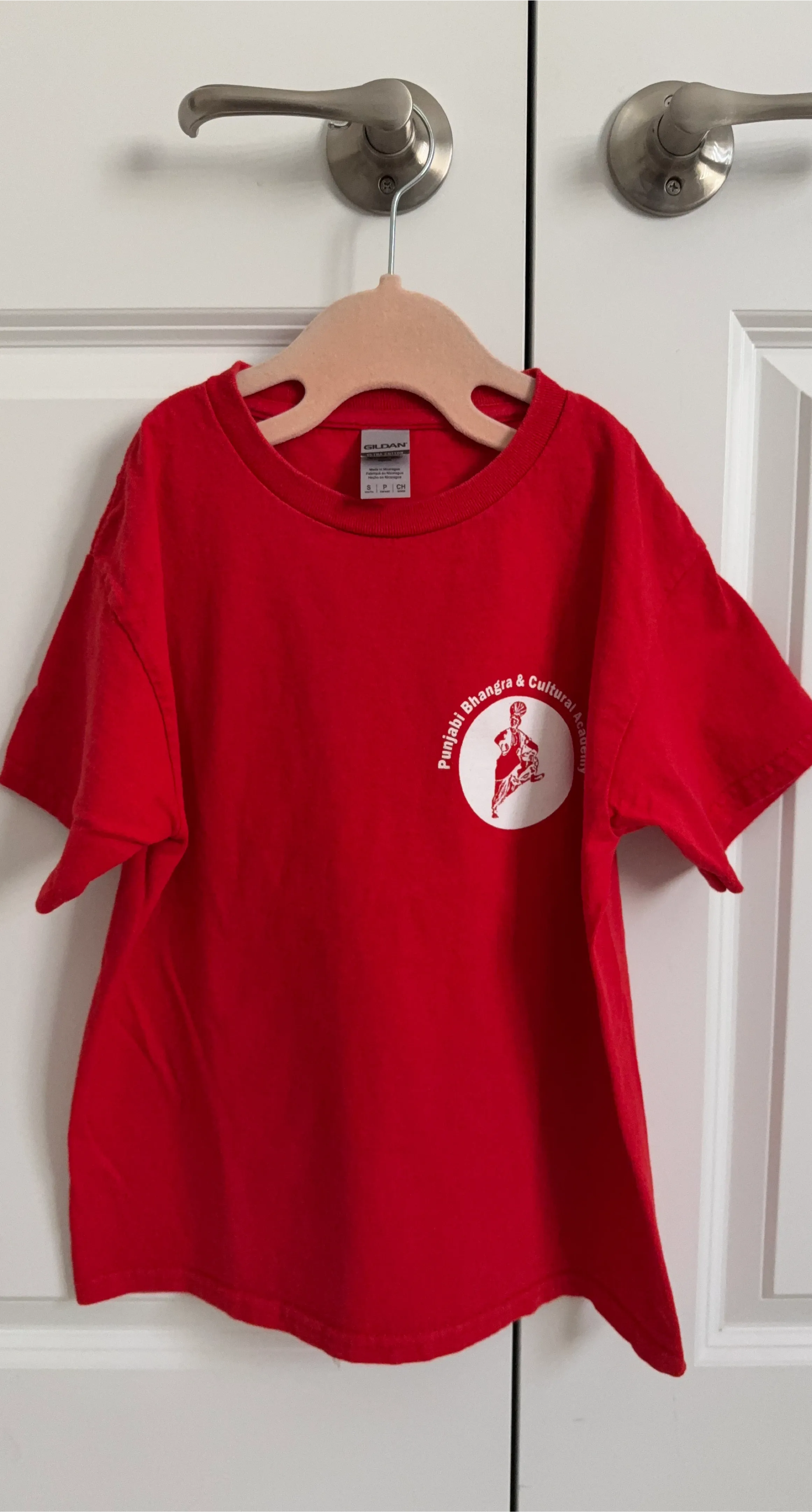 Selling a red Gildan t-shirt with the Punjabi Bhangra & Cultural Academy logo.