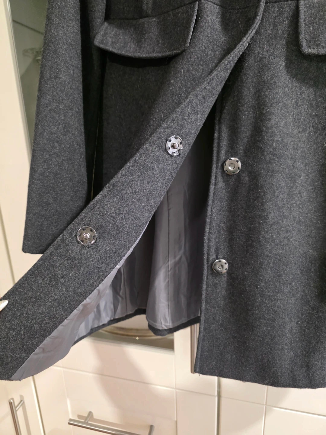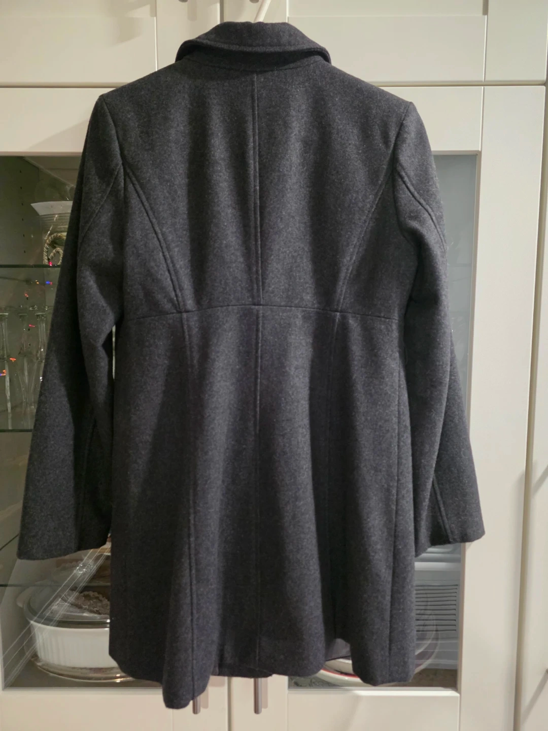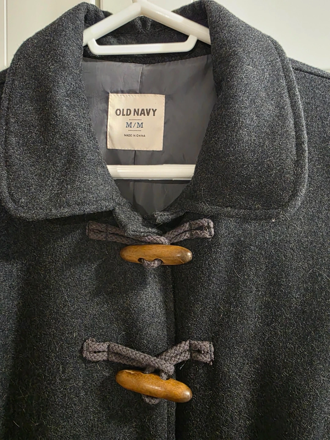 Selling a gently used Old Navy coat in size medium. It's a grey wool-blend material, perfect for fall or spring. Features a unique toggle closure and a classic design. It's in great condition and ready for a new owner!