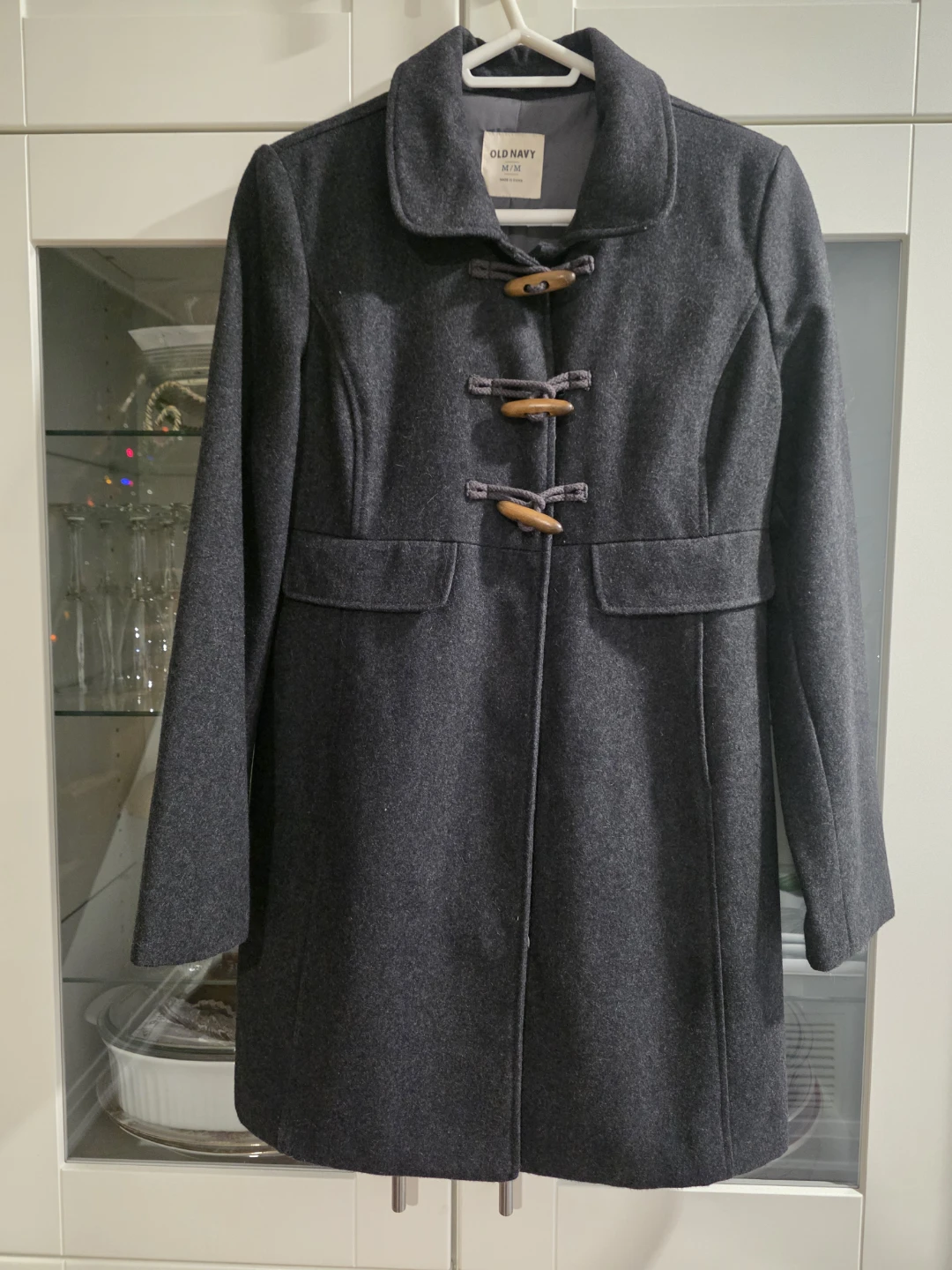 Selling a gently used Old Navy coat in size medium. It's a grey wool-blend material, perfect for fall or spring. Features a unique toggle closure and a classic design. It's in great condition and ready for a new owner!