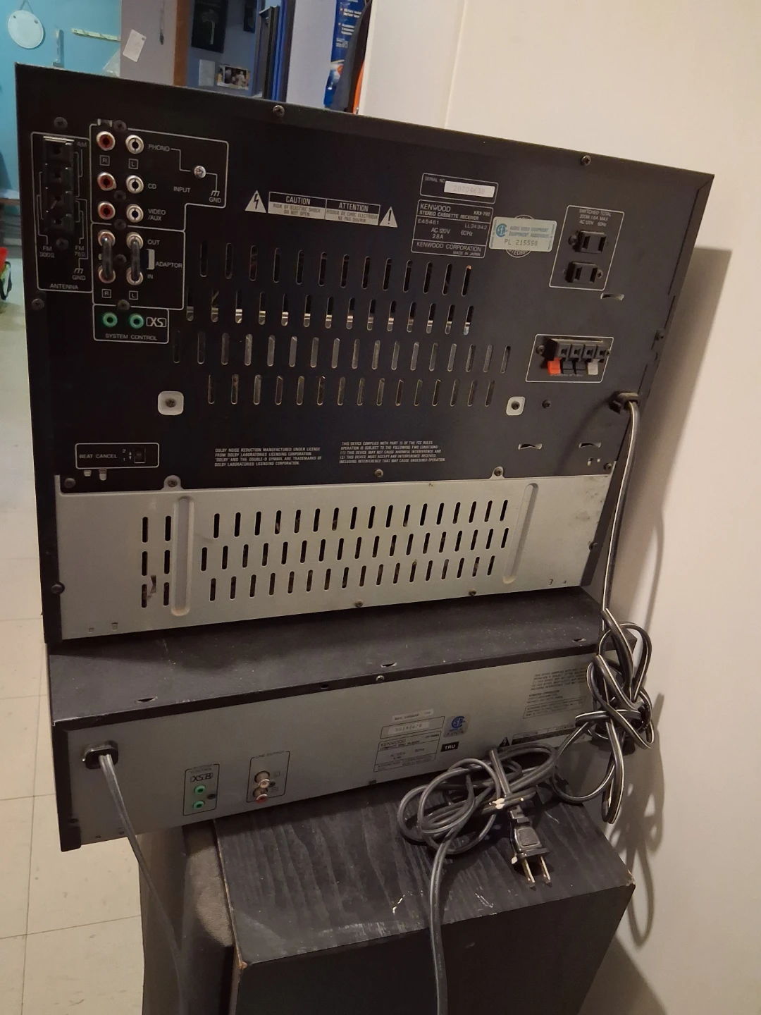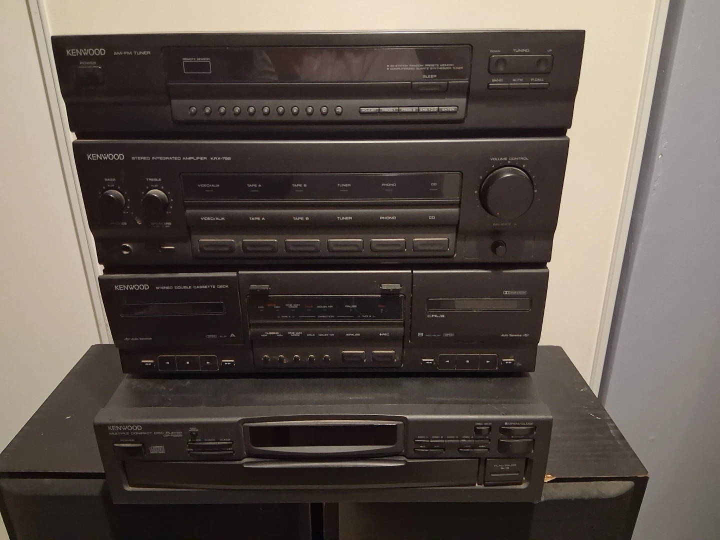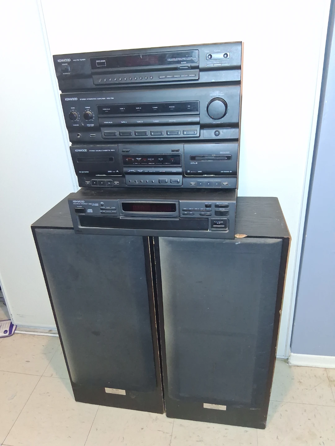 This Kenwood stereo system includes an AM/FM tuner, integrated amplifier, and a stereo double cassette deck. Multiple compact disk player and comes with two large speakers. The system is in good working order. There are a few areas that have abit of damage, if you would like pictures to show the areas ask, as I didn't have enough space in the ad for more pictures.