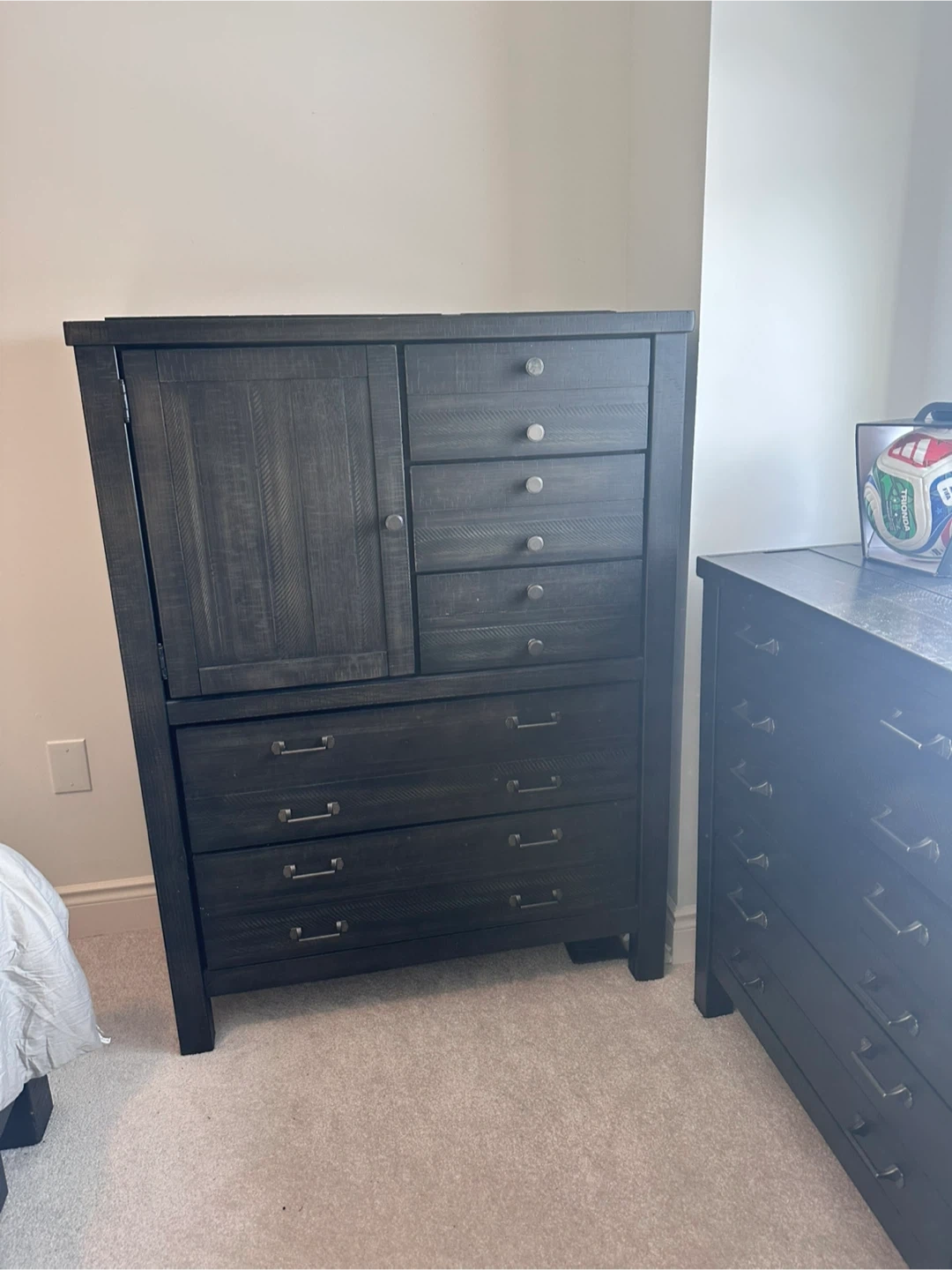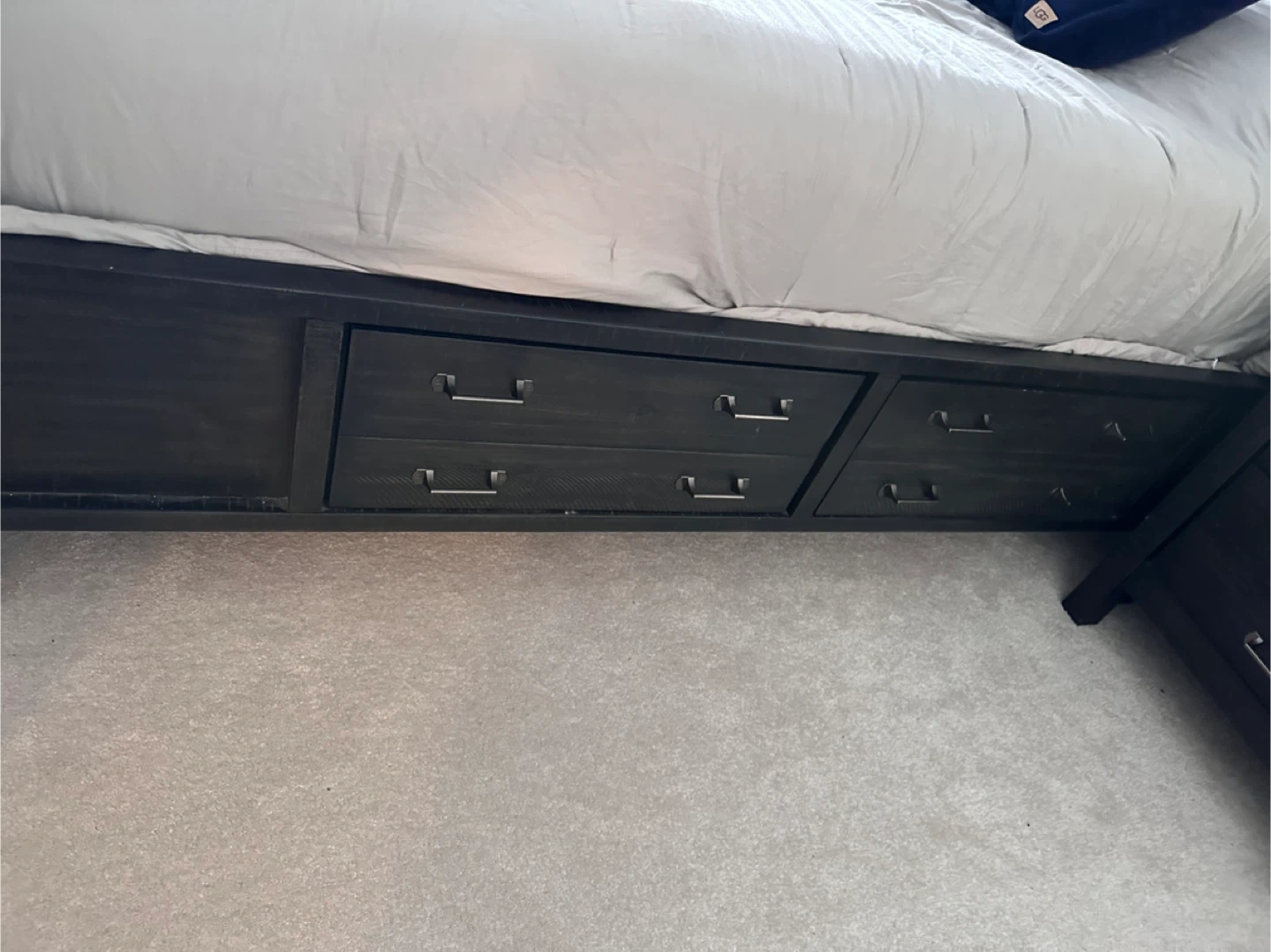 Includes queen size bed frame with storage drawers on frame, headboard (mattress not included) two matching nightstands with drawers and electrical panel on back, a large dresser and an armoire. Wood construction in a dark, distressed finish. All pieces are a matching set.