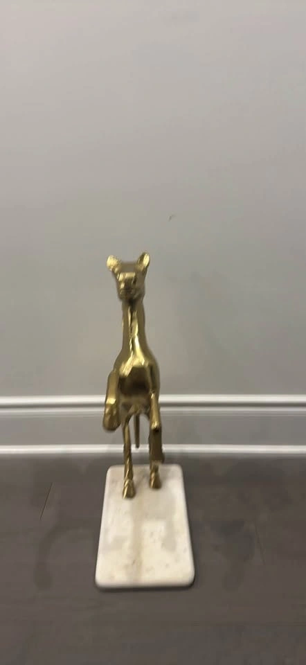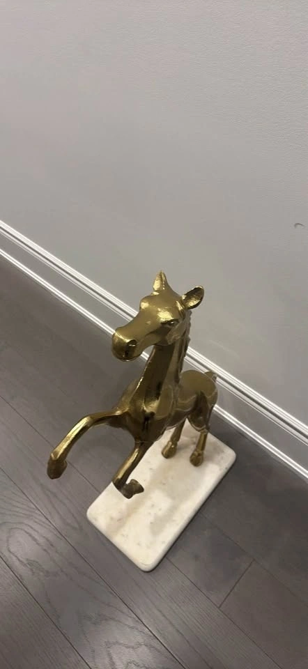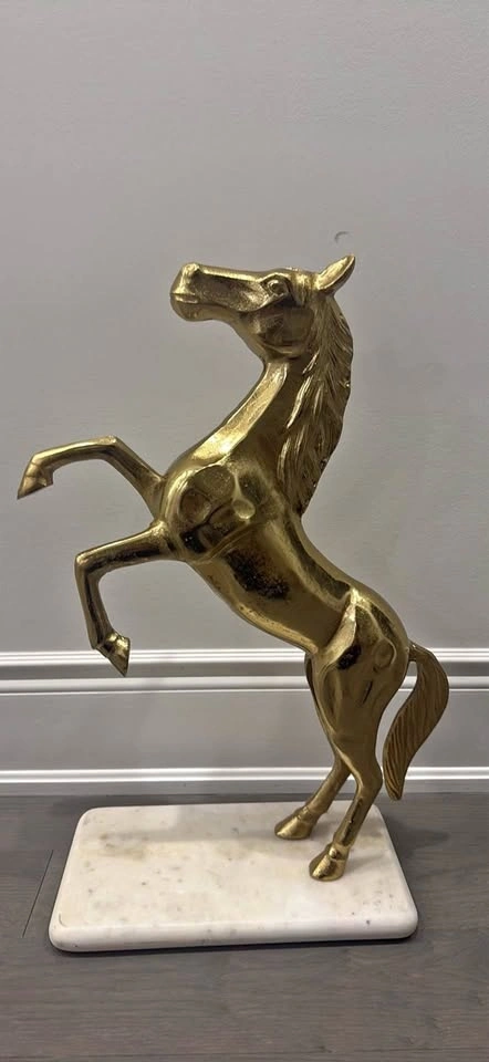 Beautiful gold horse statue featuring a rearing pose on a solid marble base. The piece has a striking metallic finish and makes a stunning statement in any living room, office, or entryway. Material: Metal or resin with gold finish. Base: Genuine marble or stone. Style: Vintage / modern luxury décor. Condition: Excellent – no chips or cracks. This sculpture adds elegance and charm to any space and is perfect for horse lovers or collectors of fine décor.