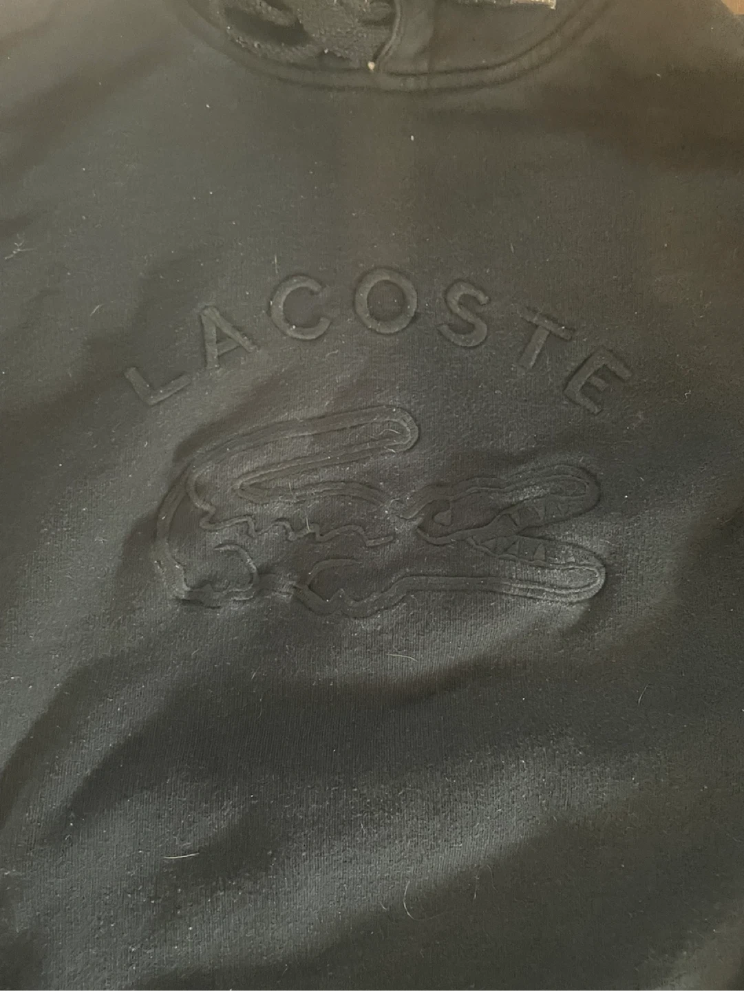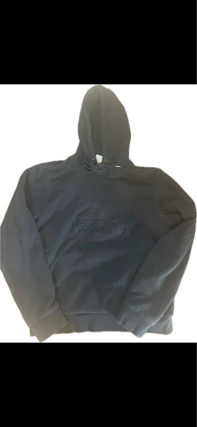 This is a black Lacoste hoodie with an embossed logo. It features a drawstring hood and a front pouch pocket. The chest width measures approximately 19 inches.