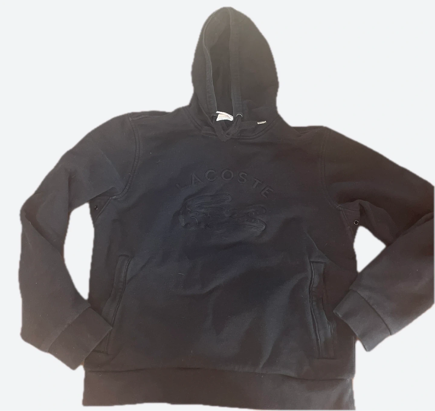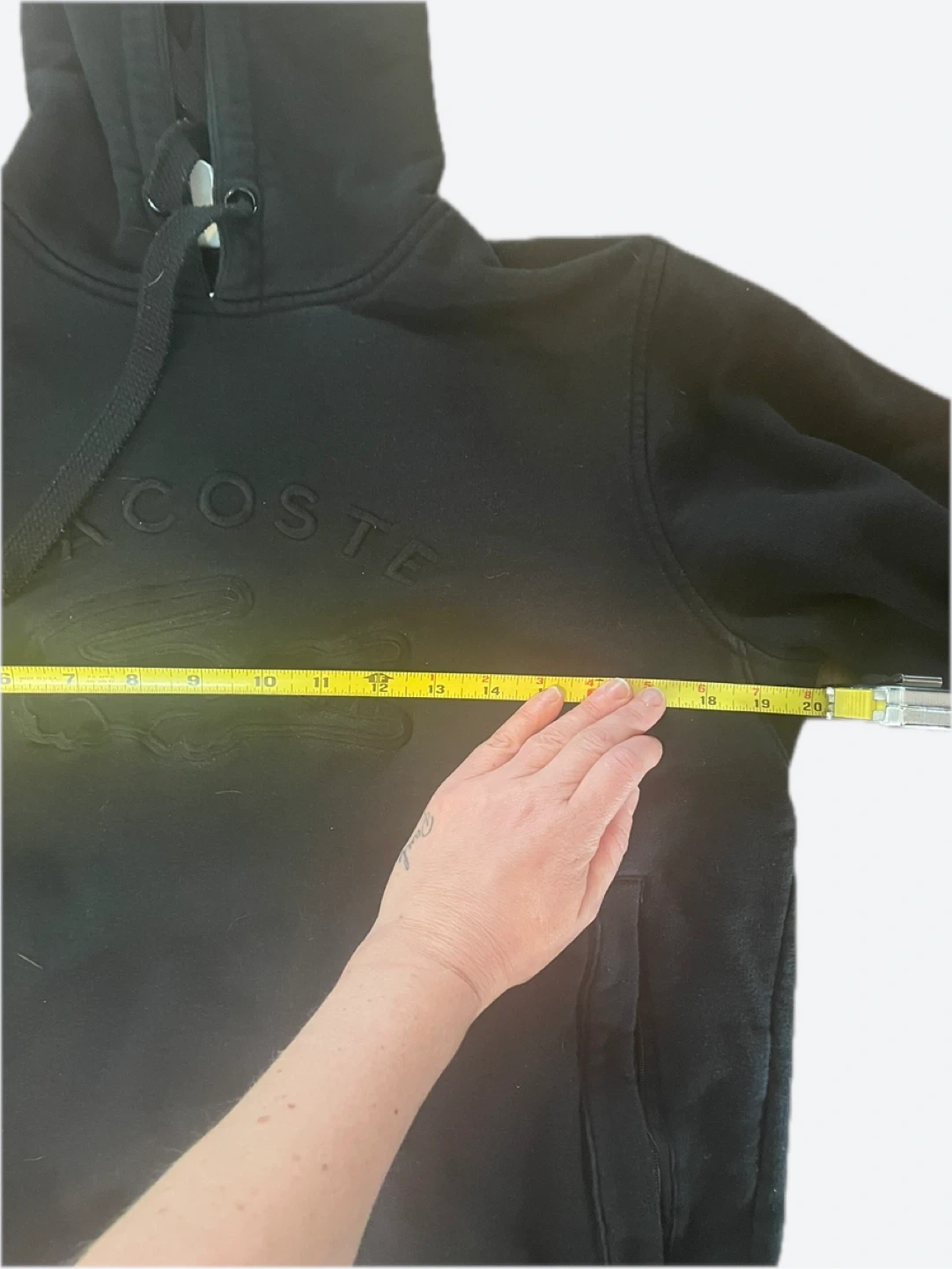 This is a black Lacoste hoodie with an embossed logo. It features a drawstring hood and a front pouch pocket. The chest width measures approximately 19 inches.