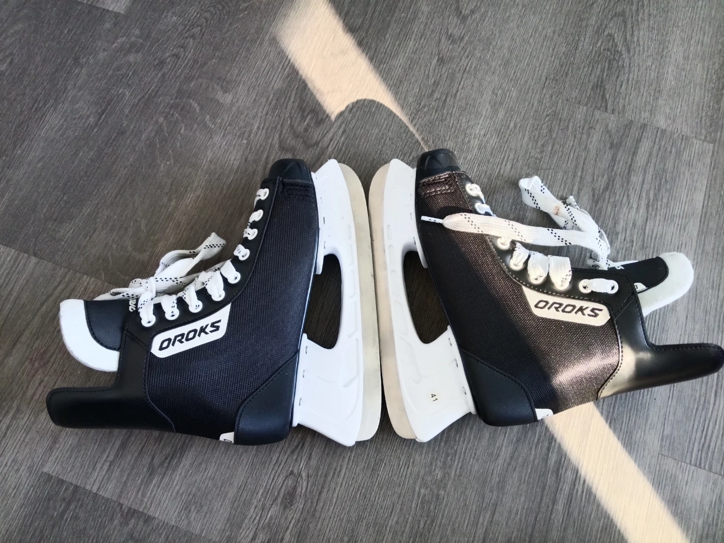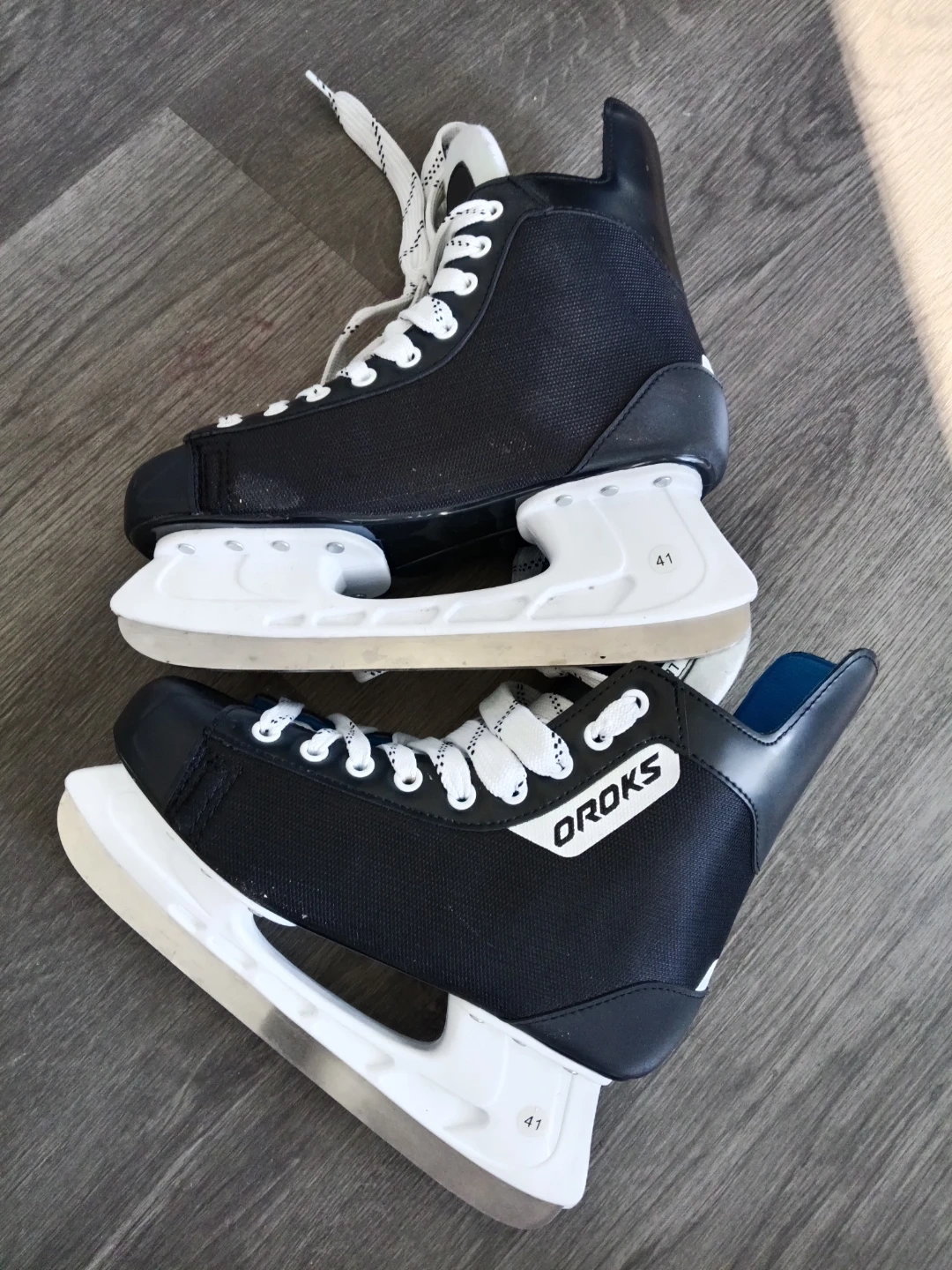 OROKS ice skates in black. Size 41 with white laces and blades. These skates are ready for the rink! Used only twice