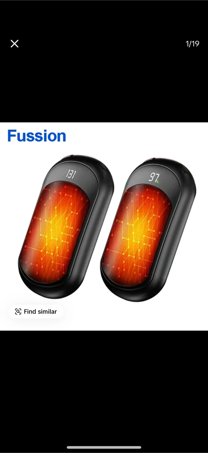 Fussion rechargeable hand warmers in black. Features a digital display showing temperature settings. Includes USB charging capability for convenient use. These are great for keeping your hands warm on cold days!