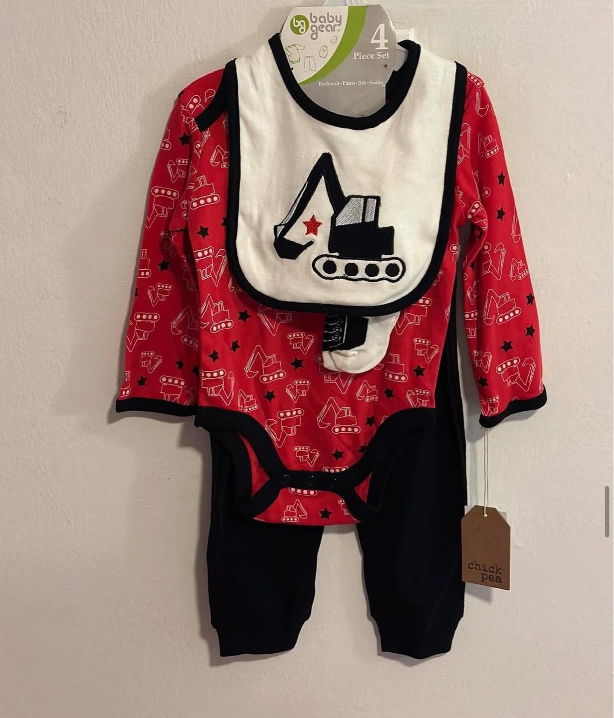 This adorable Chick Pea 4-piece set features a long-sleeve bodysuit with a cute excavator print, matching black pants, and a bib with an excavator design, perfect for your little construction fan, and it is brand new with tags.