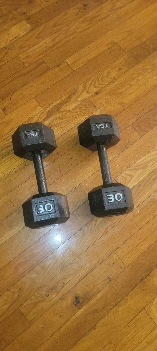 Pair of 30lb hex dumbbells from TSA. These are solid cast iron weights. They're great for strength training and can be used for a variety of exercises. Needs clean and polished. Great condition