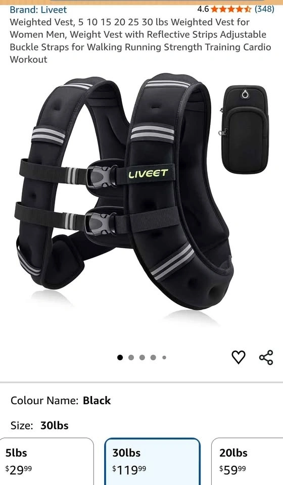 Awesome Liveet 30lb weighted vest. Has reflective strips and adjustable buckle straps. Great for walking, running, strength training, and cardio workouts. Color is black.