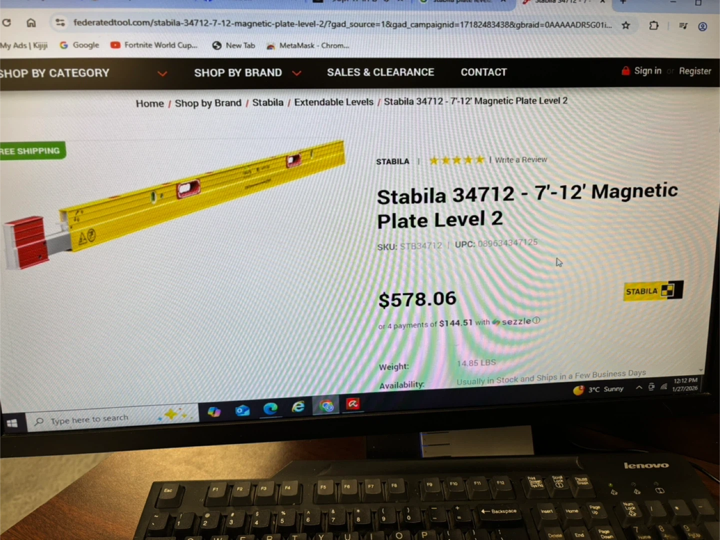 This is a Stabila 34712 Plate Level 2. It's 7 to 12 feet long and magnetic. This level is great for construction projects! absolutely brand new never been used sealed. If you like to come and view the Level before purchase, I am located at. 410 16 Ave NE Trans-Canada Building free parking in the back