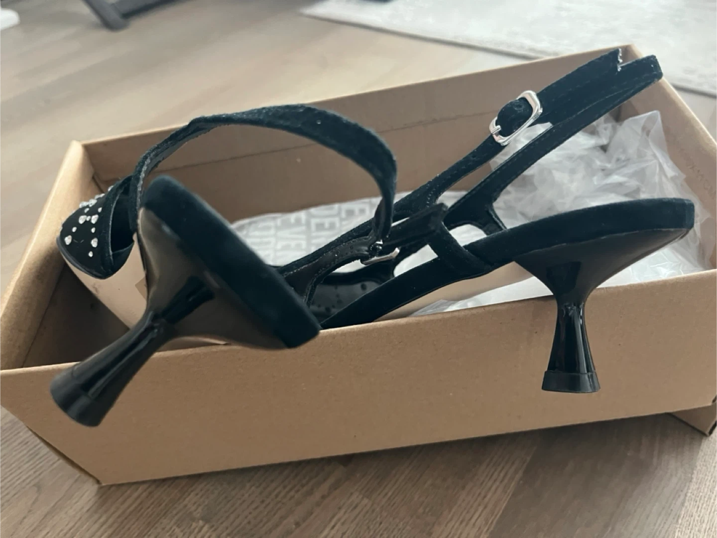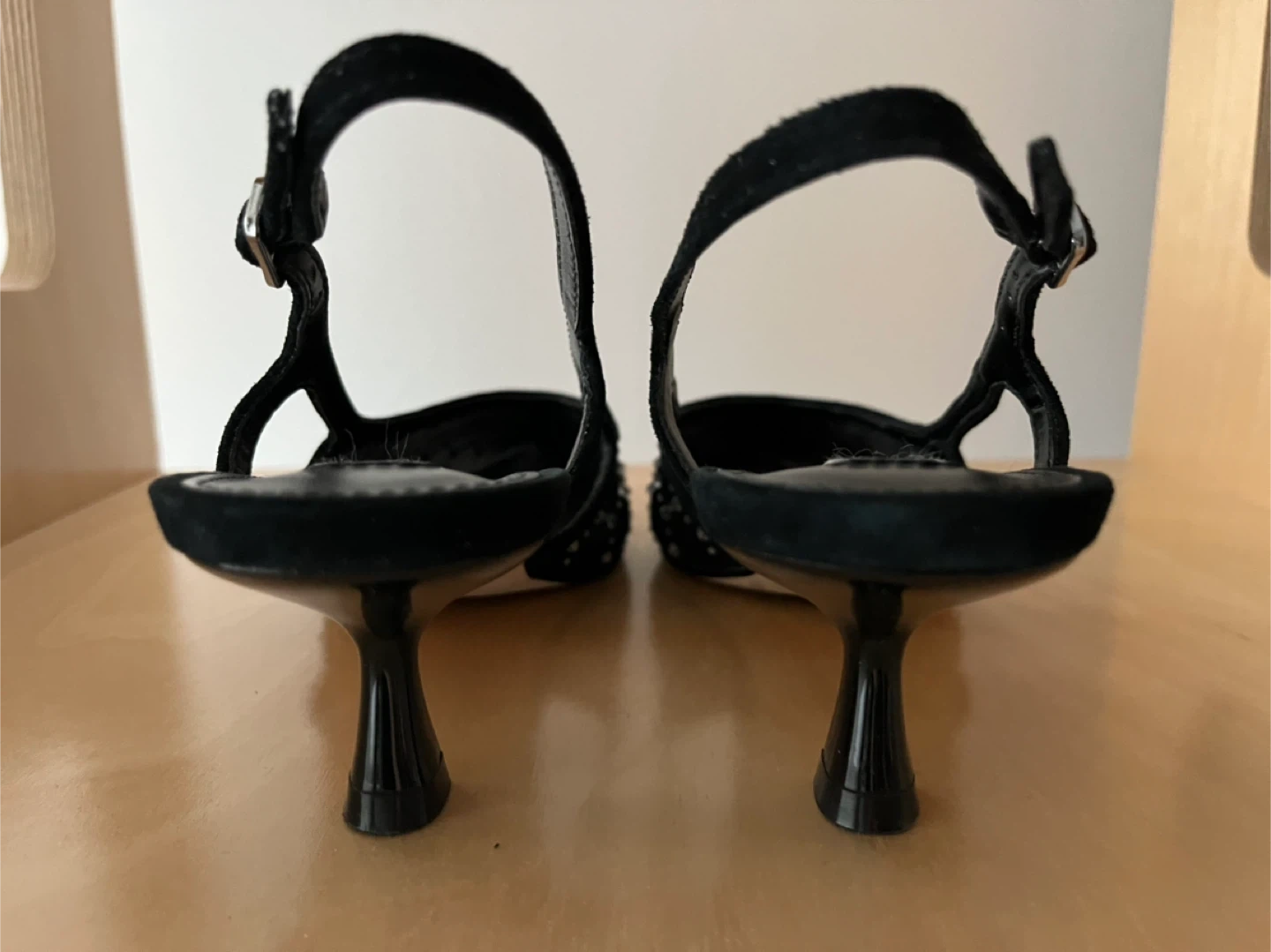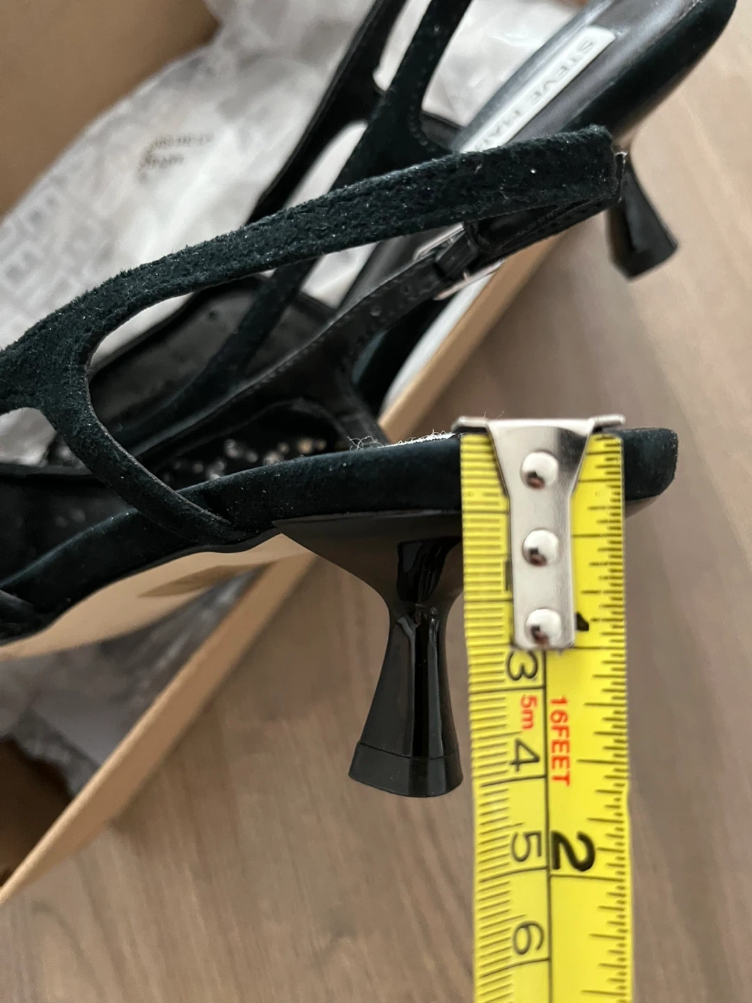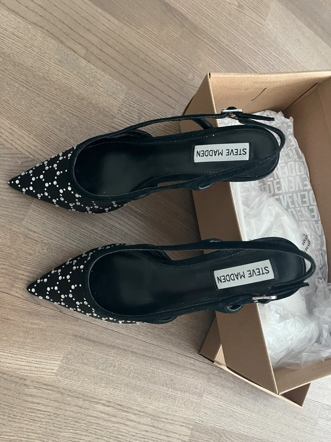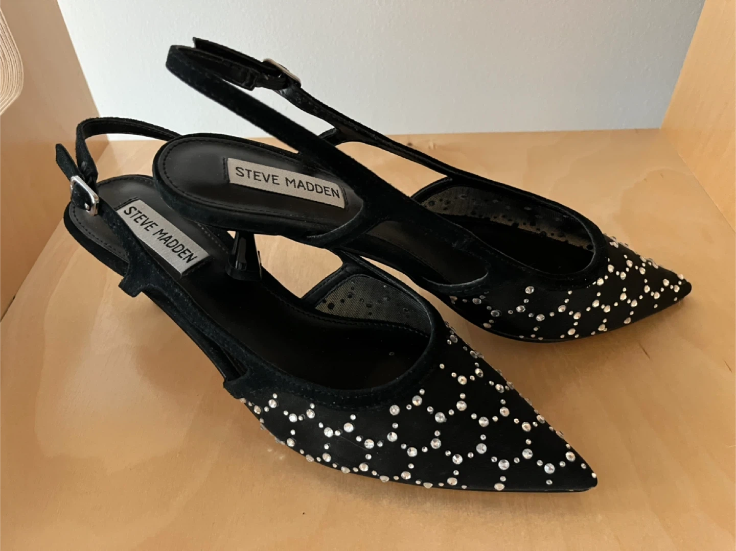 Beautiful Steve Madden black slingback heels with a pointed toe and rhinestone embellishments. Buckle strap.